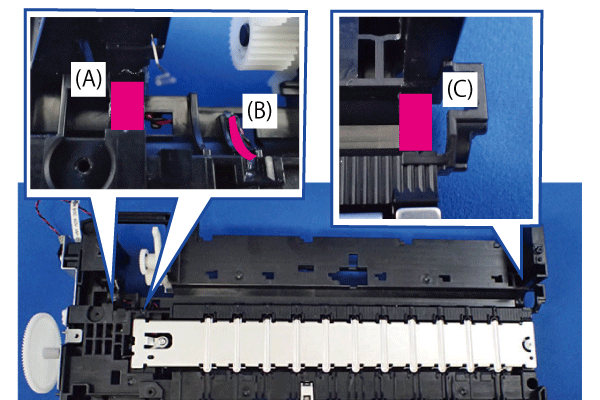 Lubrication Manner | Apply with a syringe to the contact point between Paper Guide Front Assy and PF Roller in the figure. |
