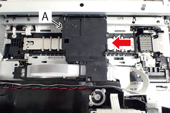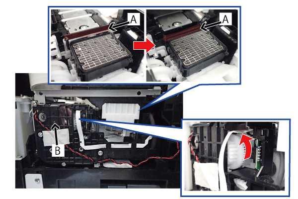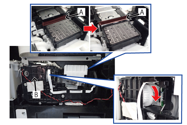 Rotate the gear of the Ink System Unit (B) in the direction of the arrow to move the Wiper (A) to wiping position.