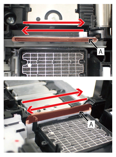 Clean the top end and right side of the Wiper (A) by moving the Polyester swab in the direction of the arrows as shown in the figure below.Caution / 注意