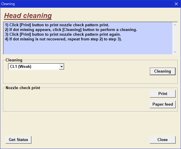 - After cleaning is finished, Click the Print button to print the nozzle check pattern. If nozzle is missing, perform Head cleaning and check the nozzle check pattern again.