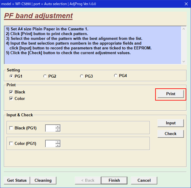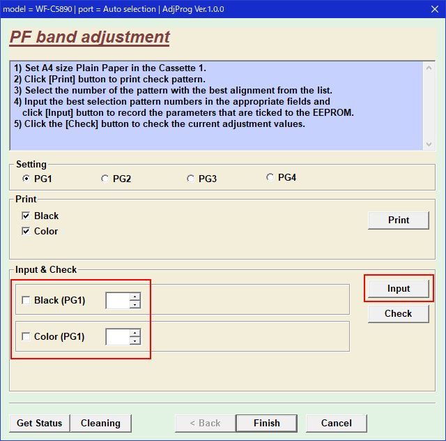 Check that an adjustment value is entered, press the Input button, and save the adjustment value in the printer.