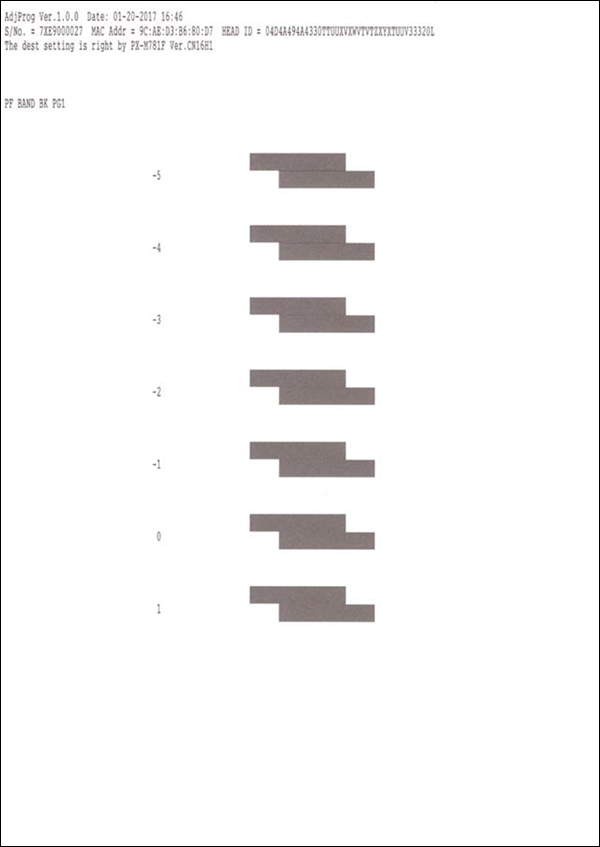 If there is no pattern satisfying the judgment method among the adjustment patterns, there is a pattern satisfying the judgment method outside the scope of pattern printing. Therefore, select the best pattern and enter the adjustment value, following which again print the adjustment pattern and determine the adjustment value. |