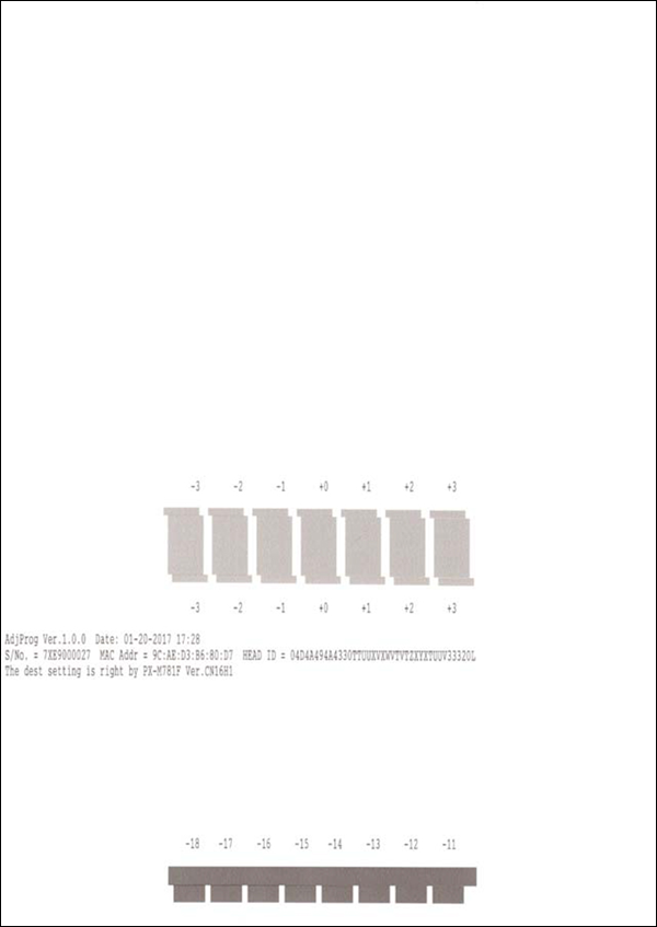 If there is no pattern satisfying the judgment method among the adjustment patterns, there is a pattern satisfying the judgment method outside the scope of pattern printing. Therefore, select the best pattern and enter the adjustment value, following which again print the adjustment pattern and determine the adjustment value. |