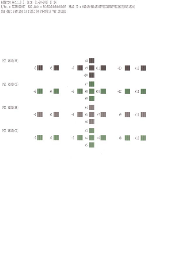 If there is no pattern satisfying the judgment method among the adjustment patterns, there is a pattern satisfying the judgment method outside the scope of pattern printing. Therefore, select the best pattern and enter the adjustment value, following which again print the adjustment pattern and determine the adjustment value. |