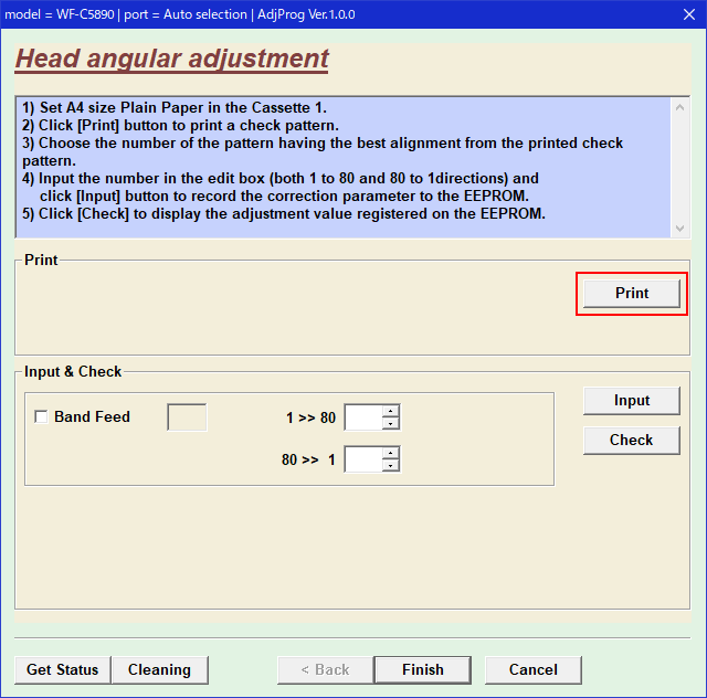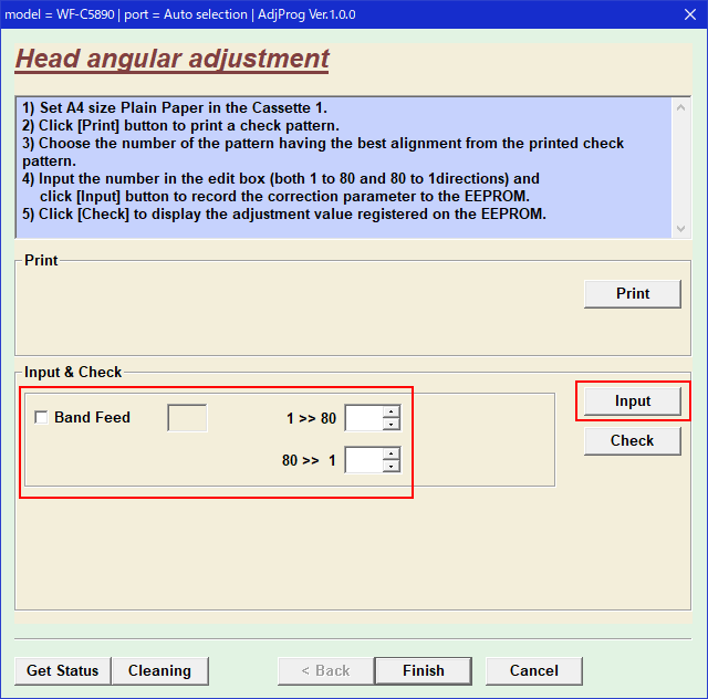 Check that an adjustment value is entered, press the Input button, and save the adjustment value in the printer.