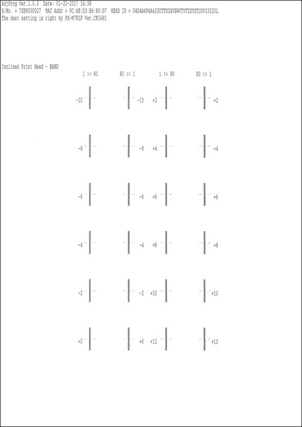 If there is no pattern satisfying the judgment method among the adjustment patterns, there is a pattern satisfying the judgment method outside the scope of pattern printing. Therefore, select the best pattern and enter the adjustment value, following which again print the adjustment pattern and determine the adjustment value. |