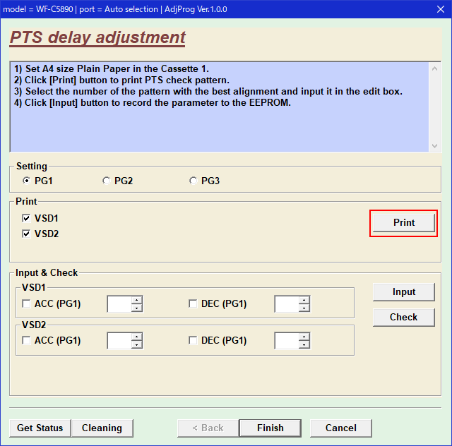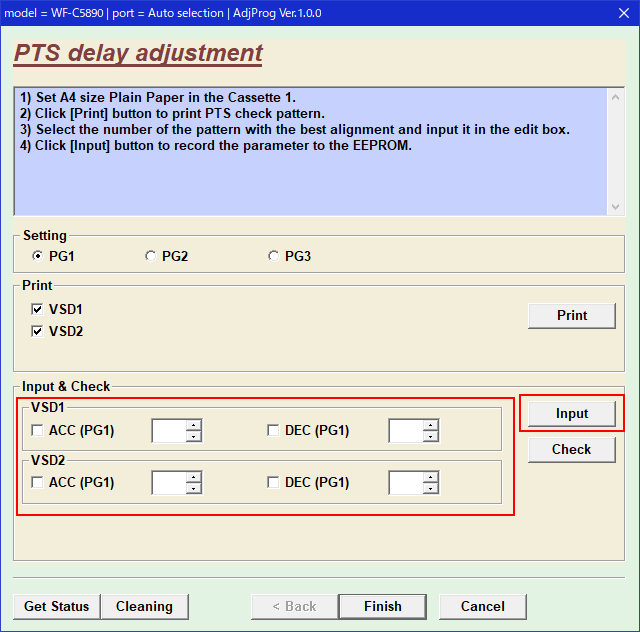Check that an adjustment value is entered, press the Input button, and save the adjustment value in the printer.
