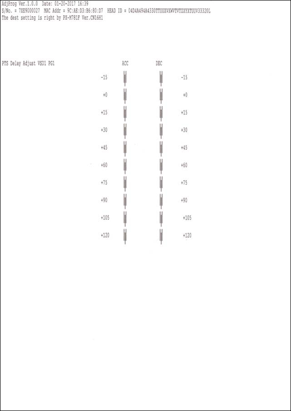 If there is no pattern satisfying the judgment method among the adjustment patterns, there is a pattern satisfying the judgment method outside the scope of pattern printing. Therefore, select the best pattern and enter the adjustment value, following which again print the adjustment pattern and determine the adjustment value. |