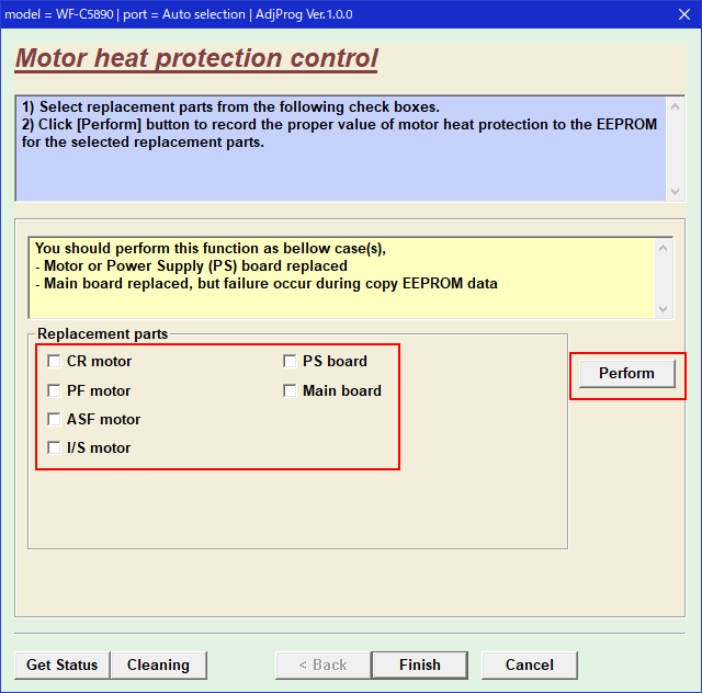 - Place a check mark for the replaced component, press the Perform button, and then execute motor heat protection control.