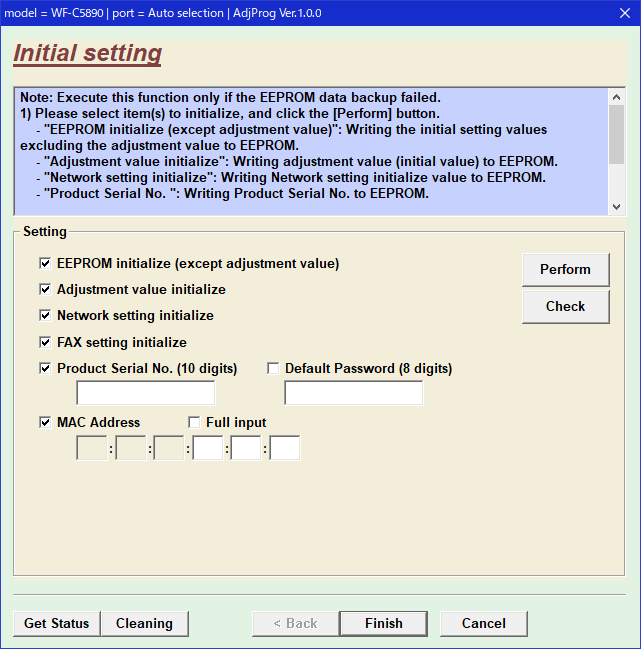 - The adjustment program automatically sets the product serial number (10 digits) as Default Password. The administrator will eventually have to set his own password again later.