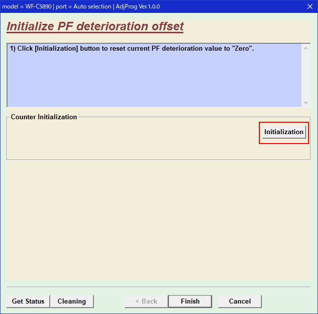 Start the Adjustment Program, and select “Initialize PF deterioration offset”.