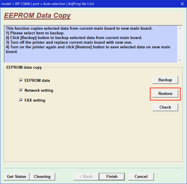 - Press the Restore button on the EEPROM Data Copy menu to restore the data.