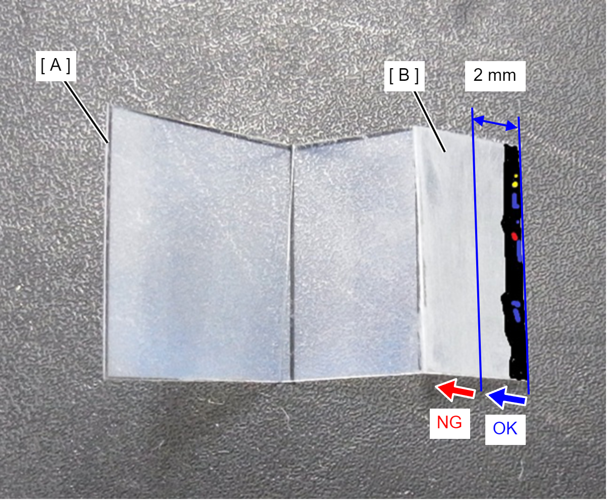 Check whether or not ink is adhered at a position of 2 mm or more from the leading edge of the cloudy surface of the jig.Pass (no ink leak)