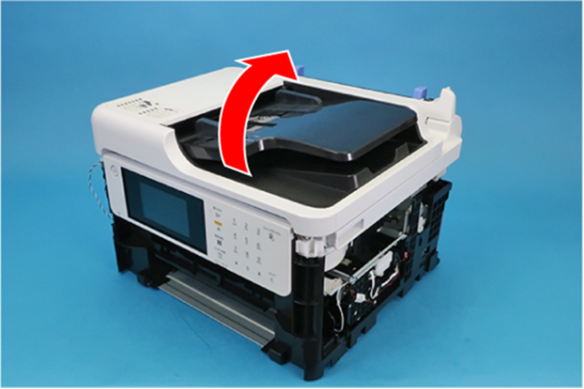 - Open the Printer Cover (A) and remove the four screws, and then remove the Housing ASF (B).