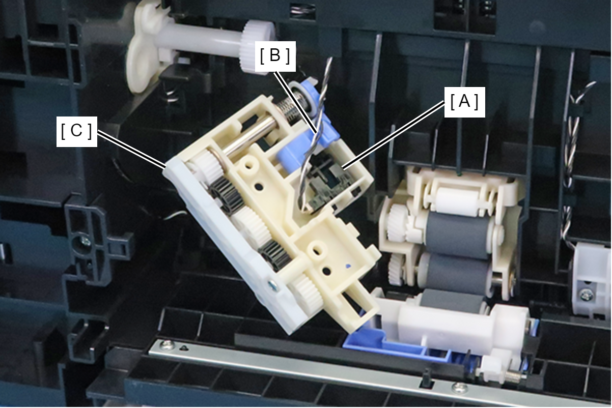 Disconnect the cable (B) from the Cassette Detection Sensor (A), and remove the ASF Housing Assy (C).