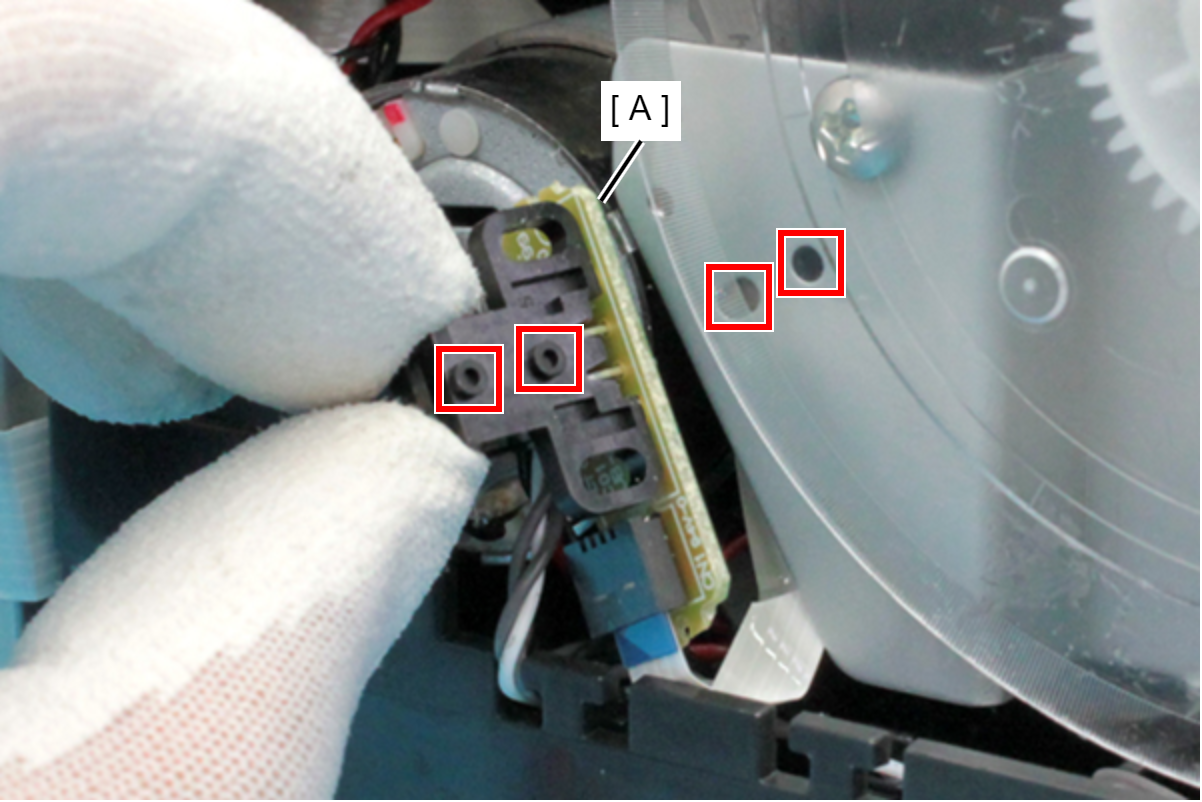 Attach the two dowels on the PF Encoder Board (A) to the positioning holes of the frame.
