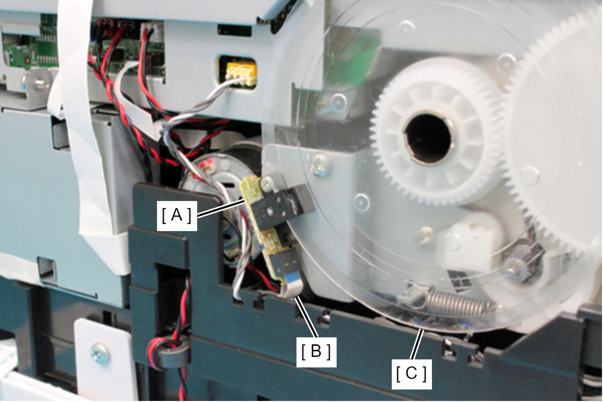 Disconnect the FFC (B) from the connector of the PF Encoder Board (A), and remove the PF Encoder Board (A) avoiding contact with the PF Scale (C).