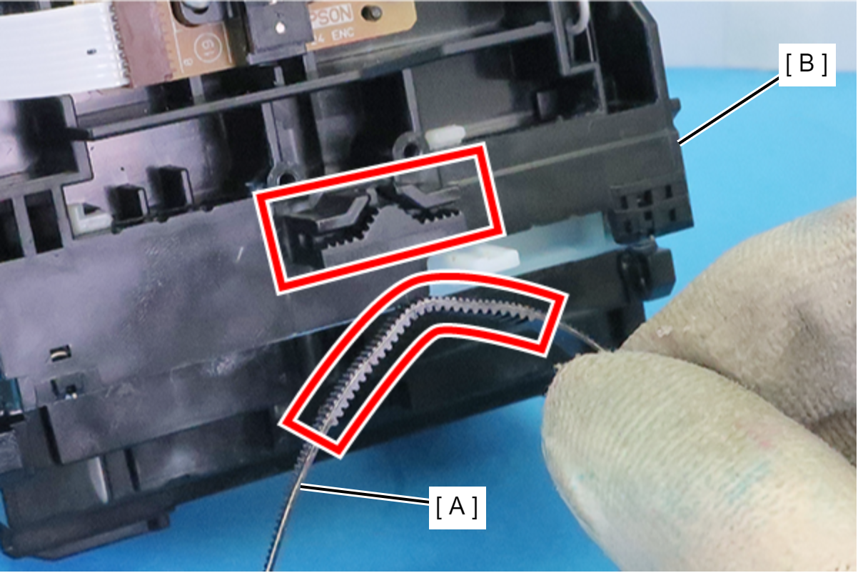 Install the CR Timing Belt (A) by aligning its toothed portion with the teeth in the groove of the CR Unit (B).