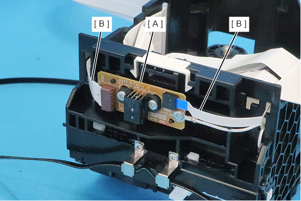 - Remove the FFCs (B) from the connector (CN1, CN2) of the CR Encoder (A).
