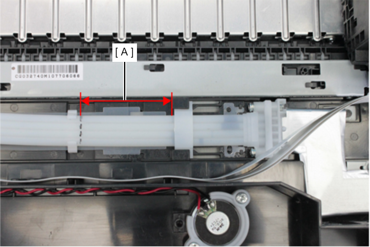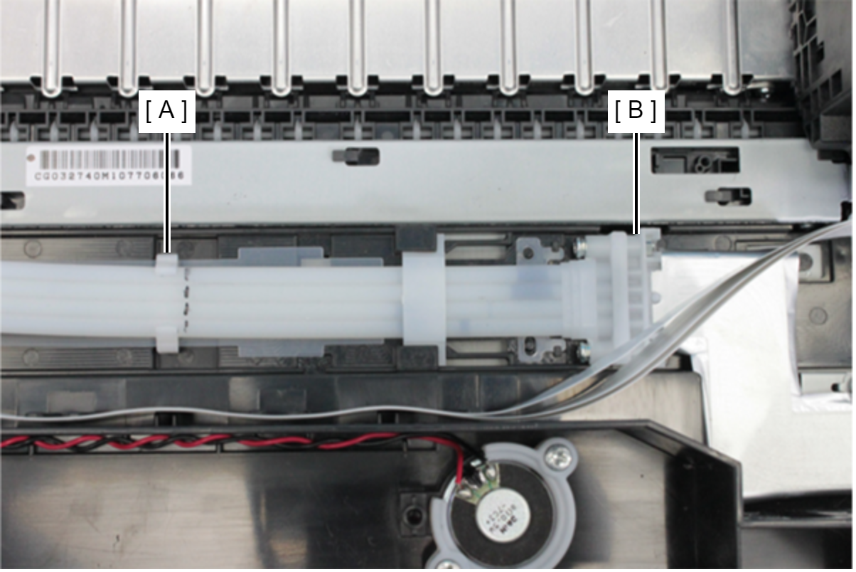 - At the marking point on the Ink Supply Tube (A), attach the Ink Supply Tube (A) to the Tube Clamp (B).