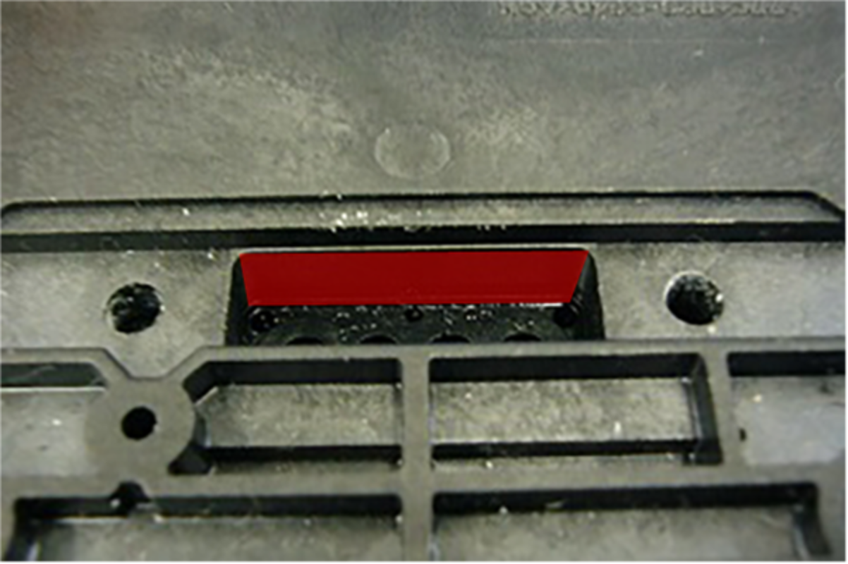 - Set the LEAK TESTER SHEET REAR (A) in the gap (B) of the Head Attachment with the smoky surface (C) upwards.