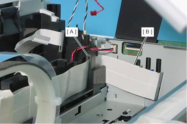- Remove the acetate tape (A), and release the cable (B) from the two guides.