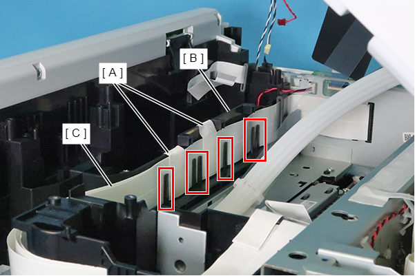 - Remove the two pieces of acetate tape (A) and release the Head FFC Assy (C) from the four tabs of the Frame Base (B).