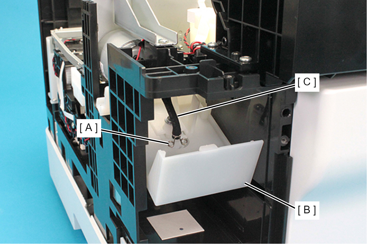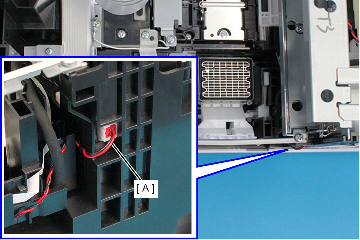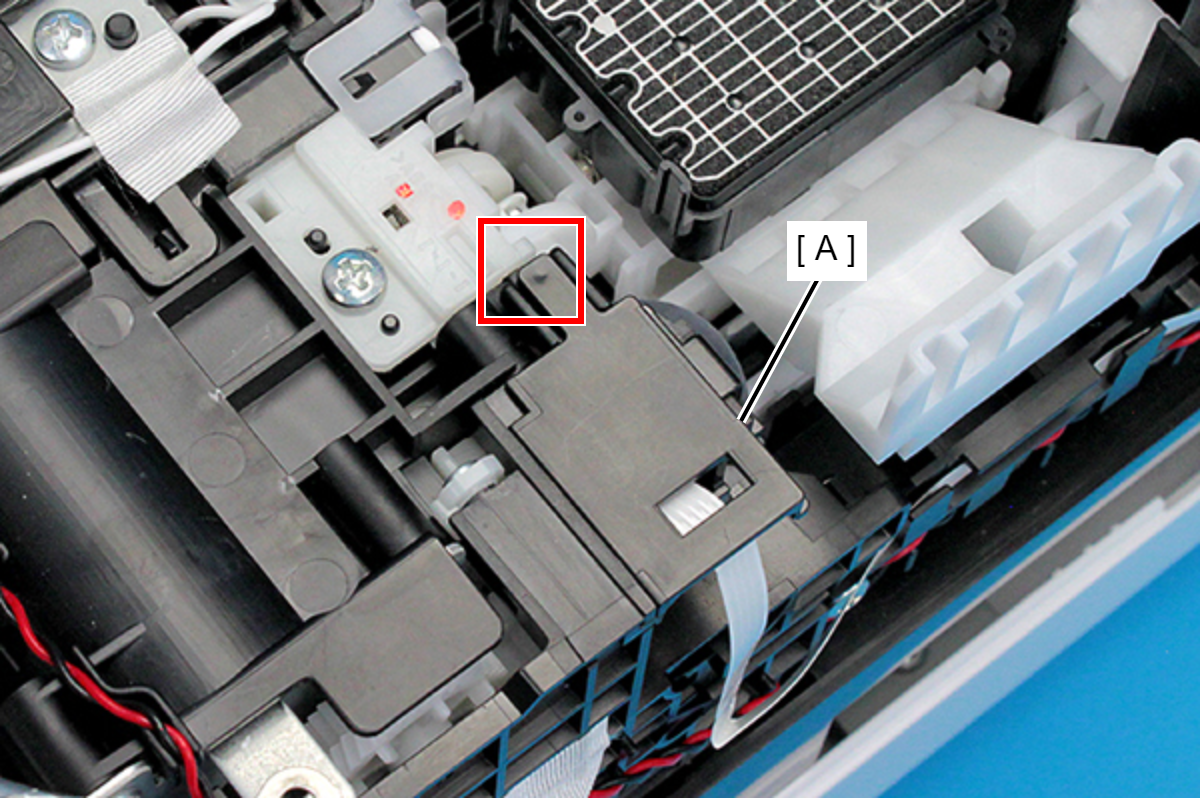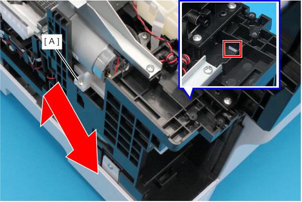 Lift the Waste Ink Duct Holder (A) up from below, slide to remove the hook while keeping the rear surface downwards, and remove the Waste Ink Duct Holder (A).