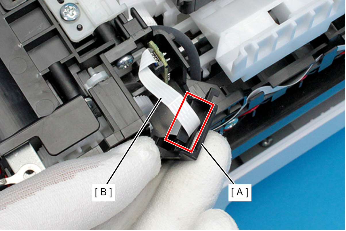Route the FFC (B) through the slit on the Upper Cap FFC Cover (A).