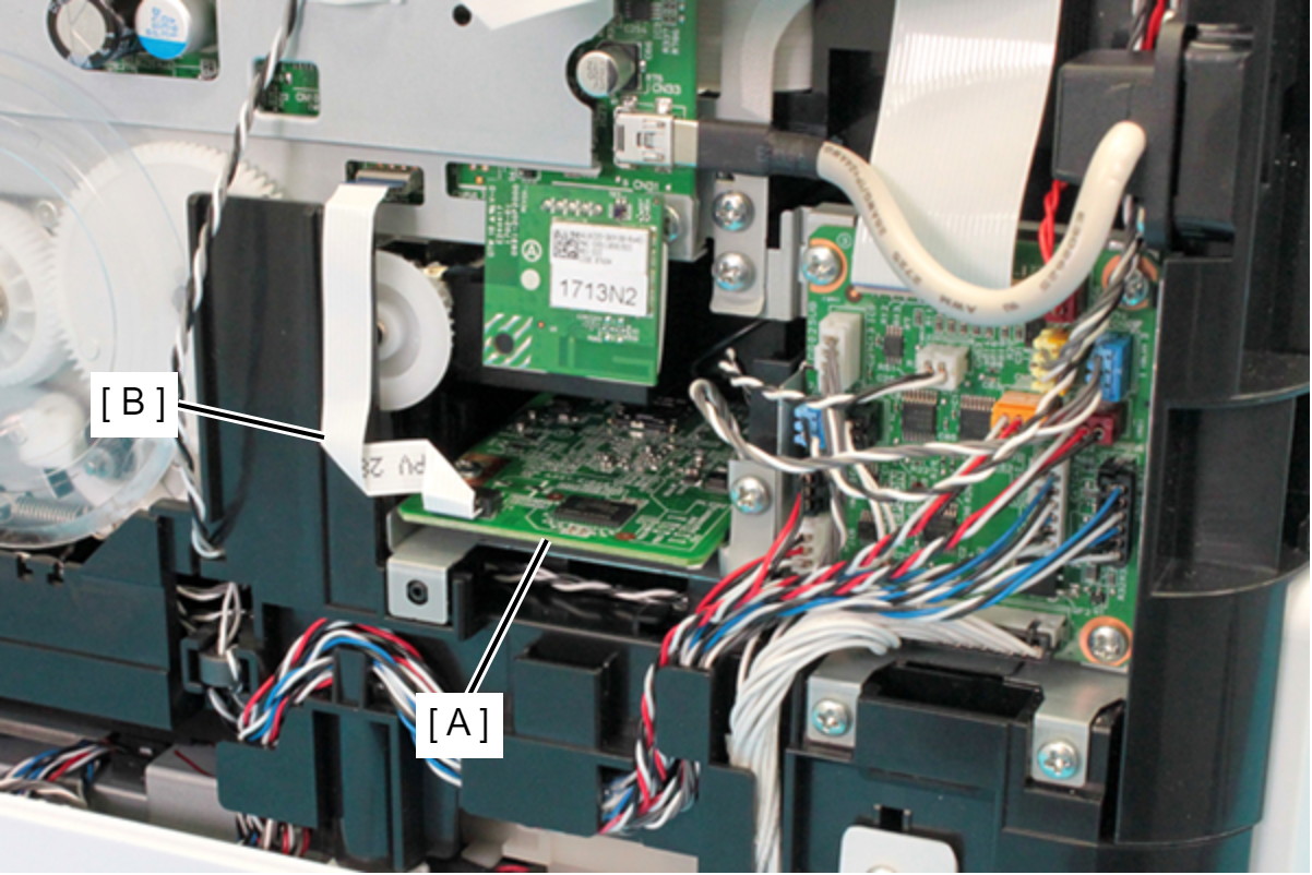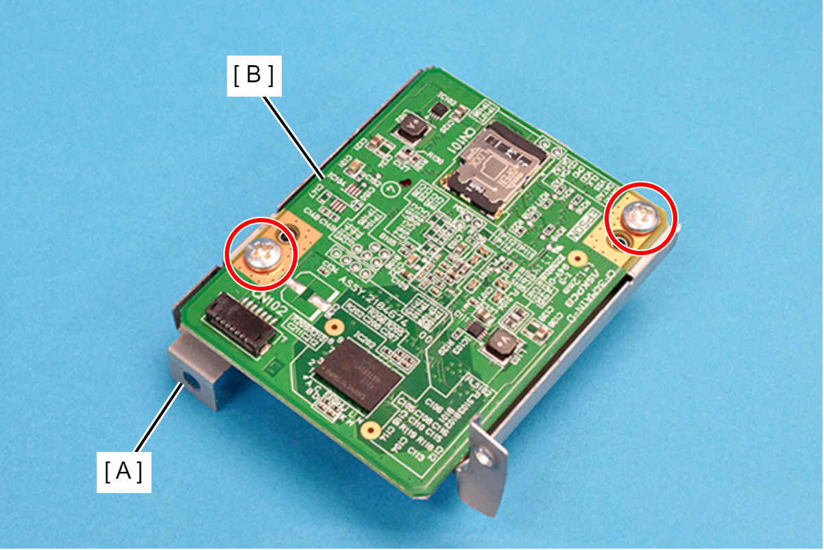 - Remove the two screws, then remove the PDL Board (B) from the Shield Plate (A).