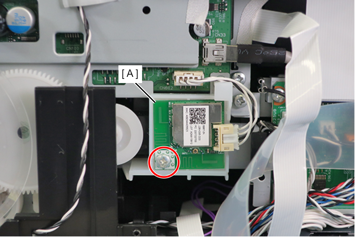 - Remove the screw, and then remove the Wireless Lan Module (A).