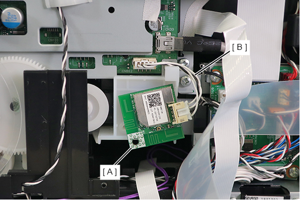 - Remove the cables (B) from the connector of the Wireless Lan Module (A), and then remove the Wireless Lan Module (A).