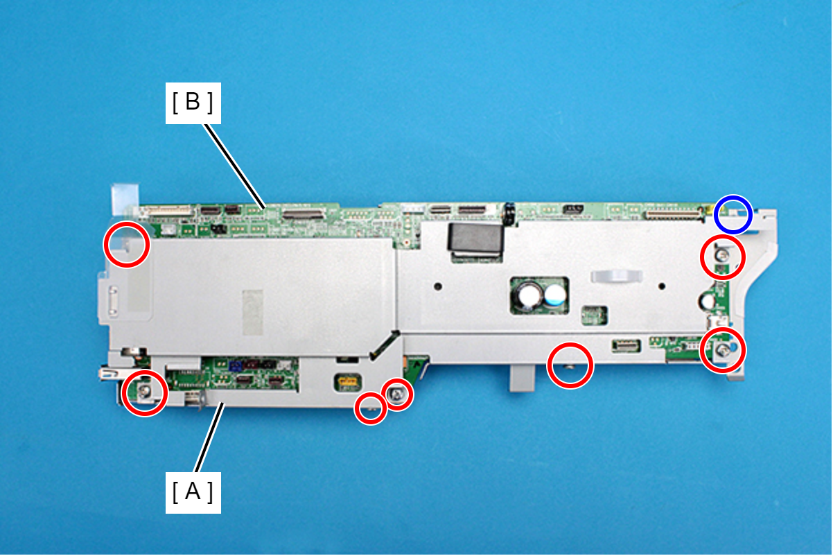- Remove the 8 screws and remove the MB Board Shield Plate Upper (A) to remove the Main Board (B).