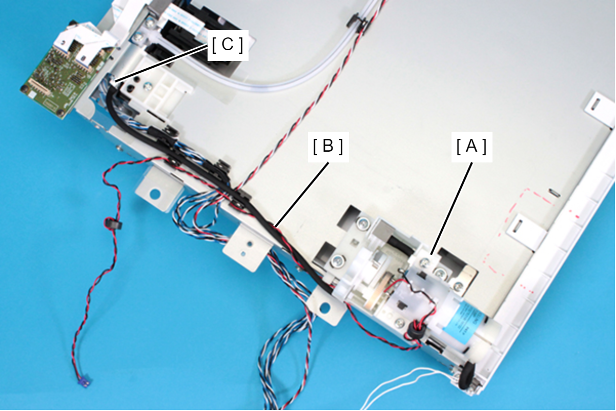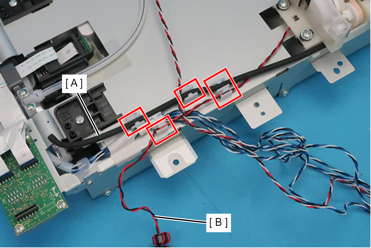 Route the cables (B) of the Ink Supply Unit (A) on the frame of the Ink Supply Unit (A).