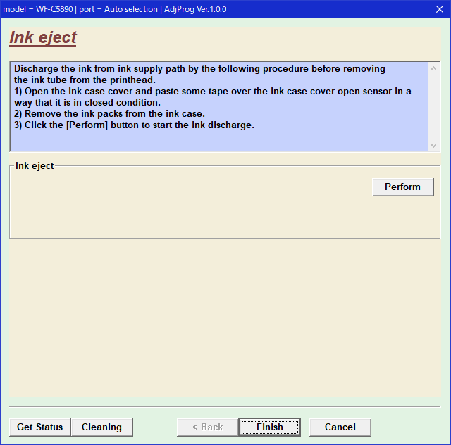 Connect the PC and printer using a USB cable and start the adjustment program, and from the adjustment program menu, select “Ink eject” and press the Perform button.