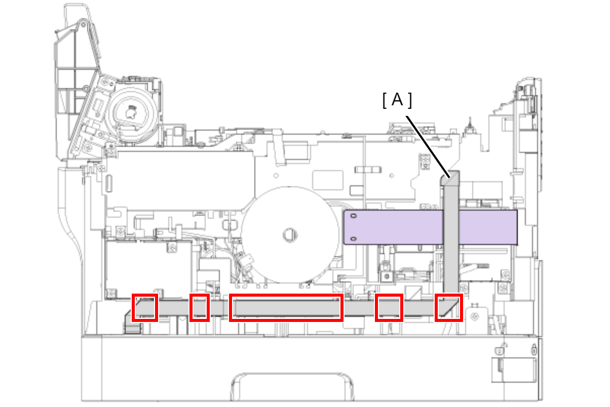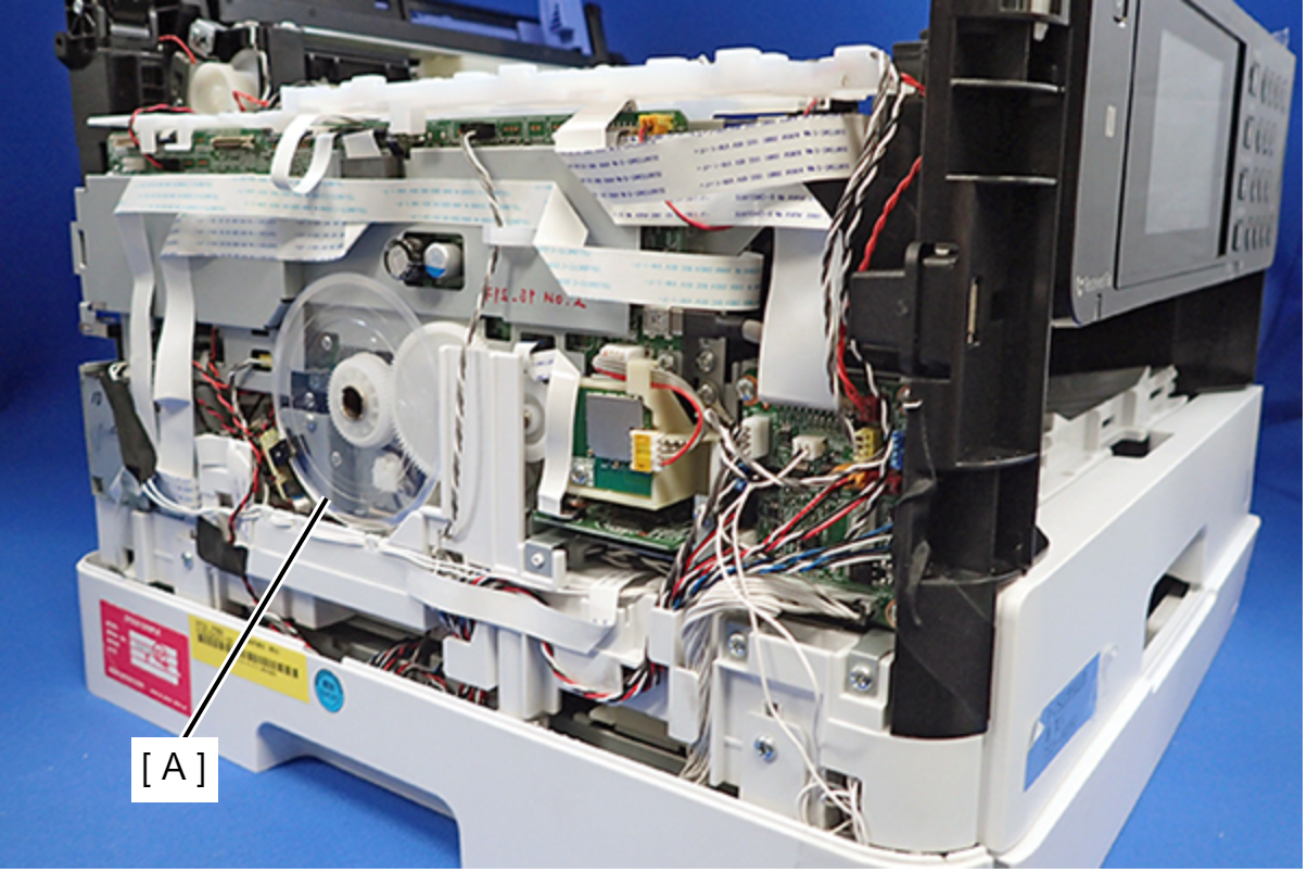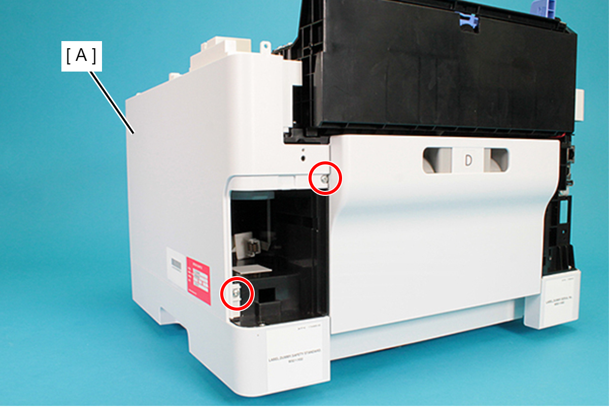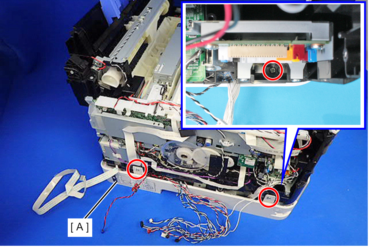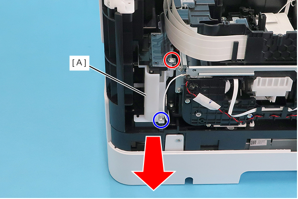 - Remove the two screws, and remove the Guide Cover (A) in the direction of the arrow.