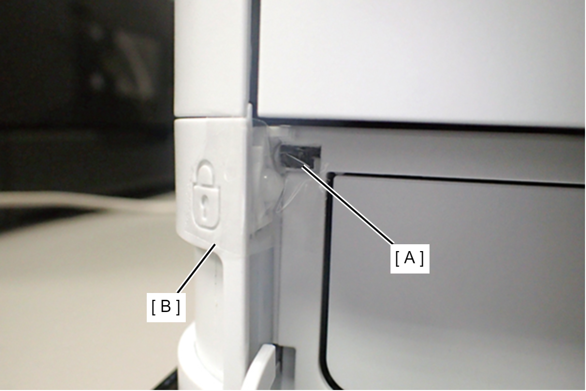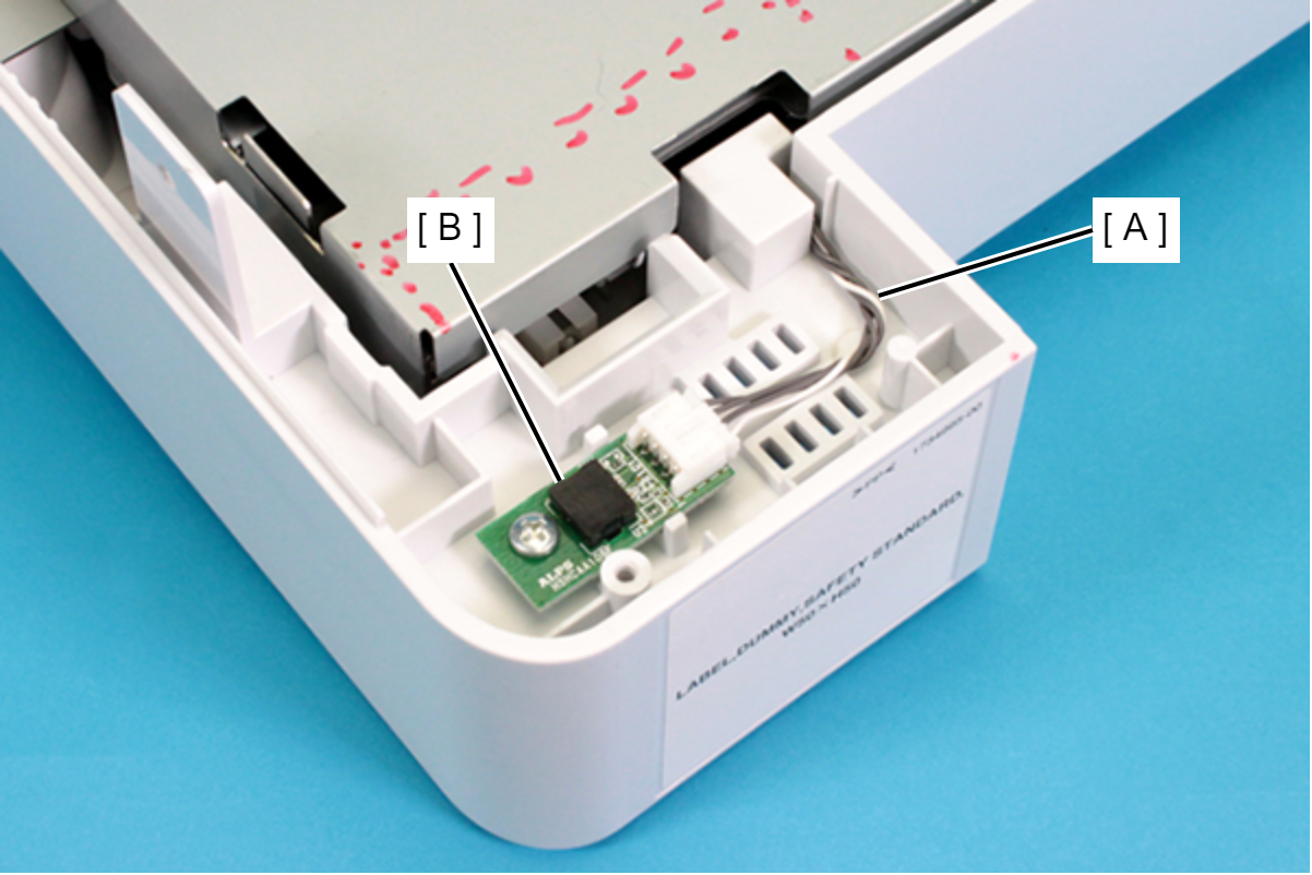 - Push the lever (A) of the Front Cover Open Sensor and secure it with tape (B).