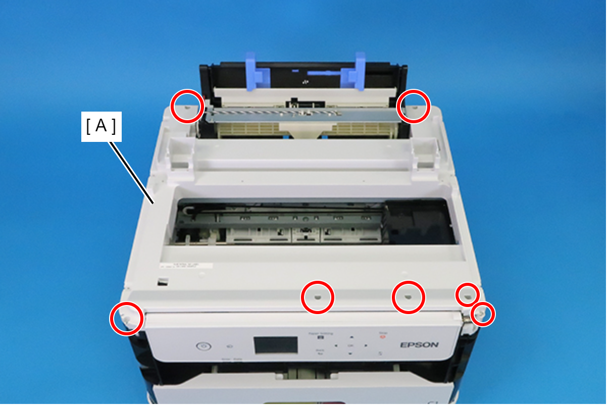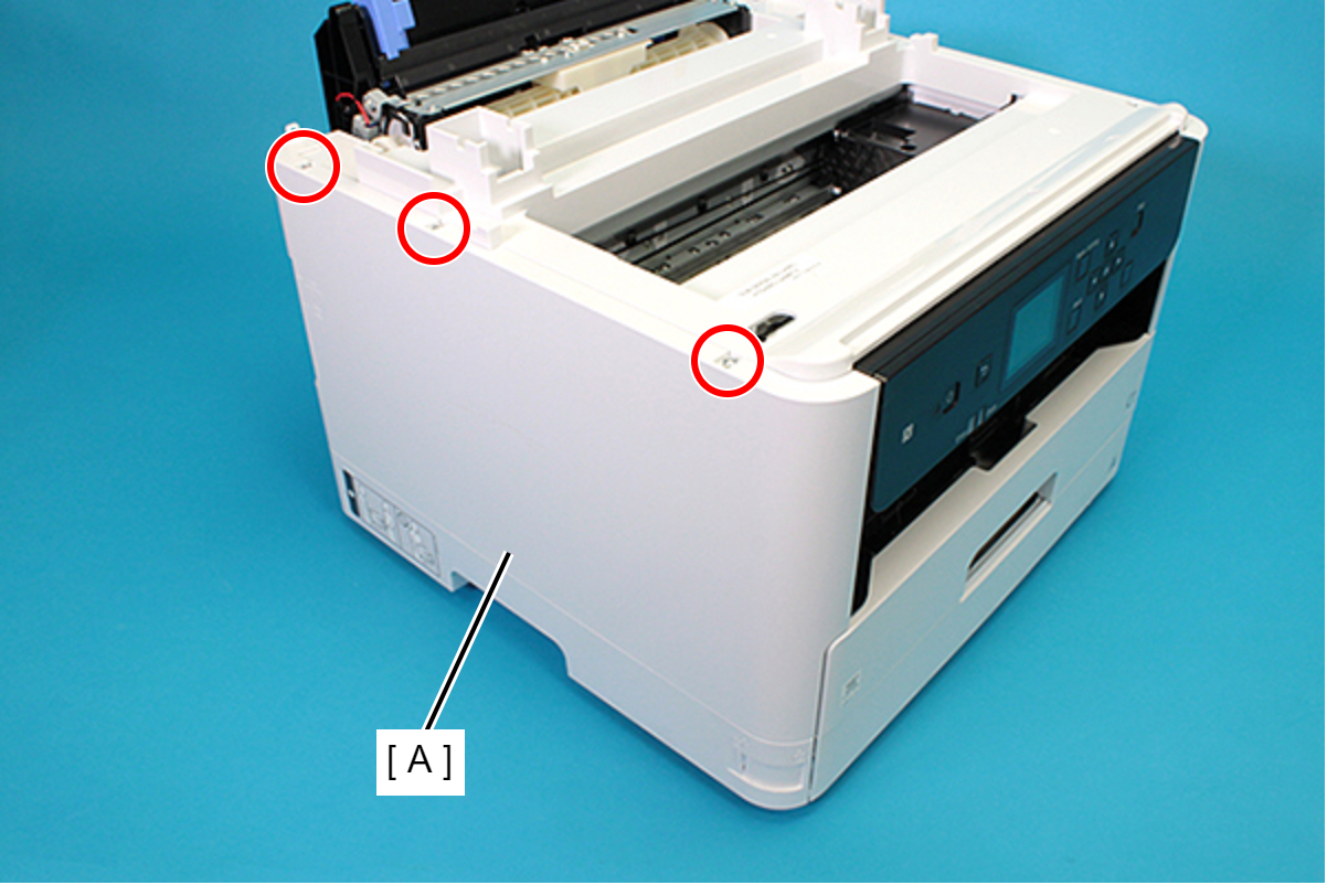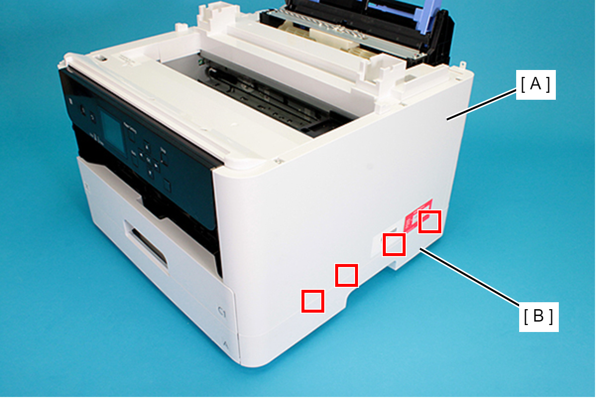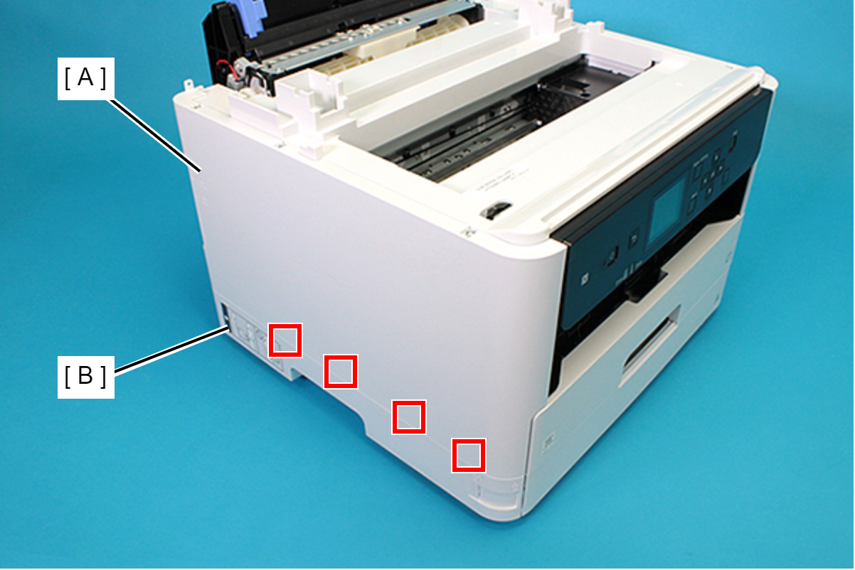 - Open the Printer Cover (A) and remove the four screws, and then remove the Housing ASF (B).