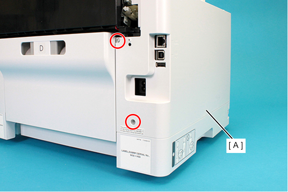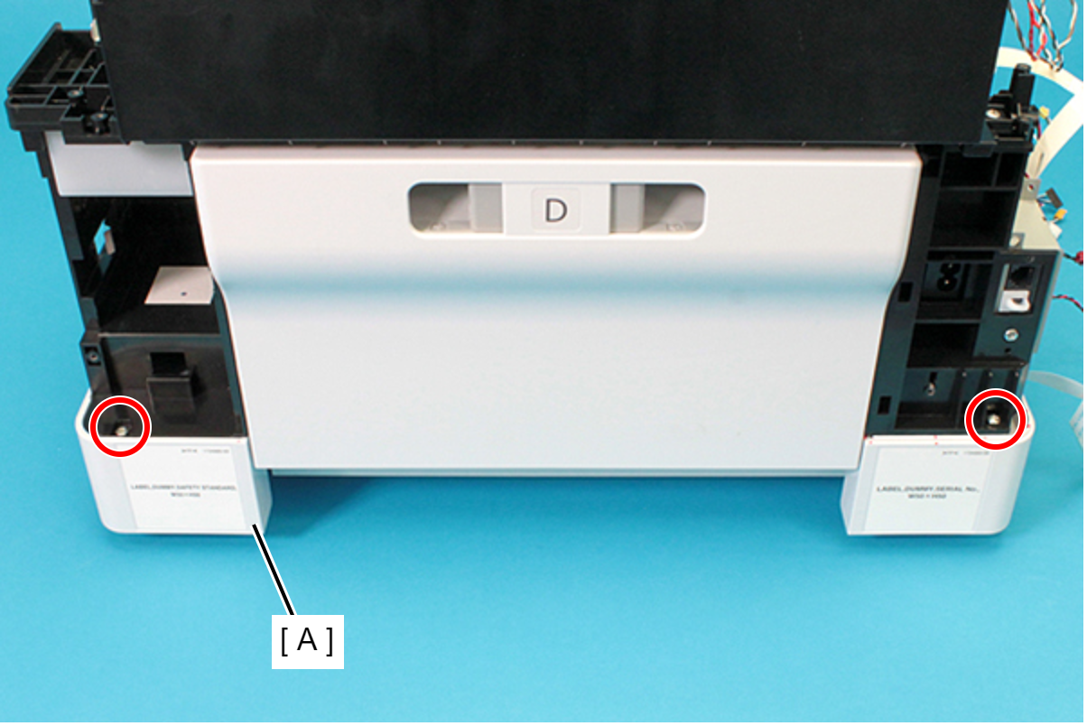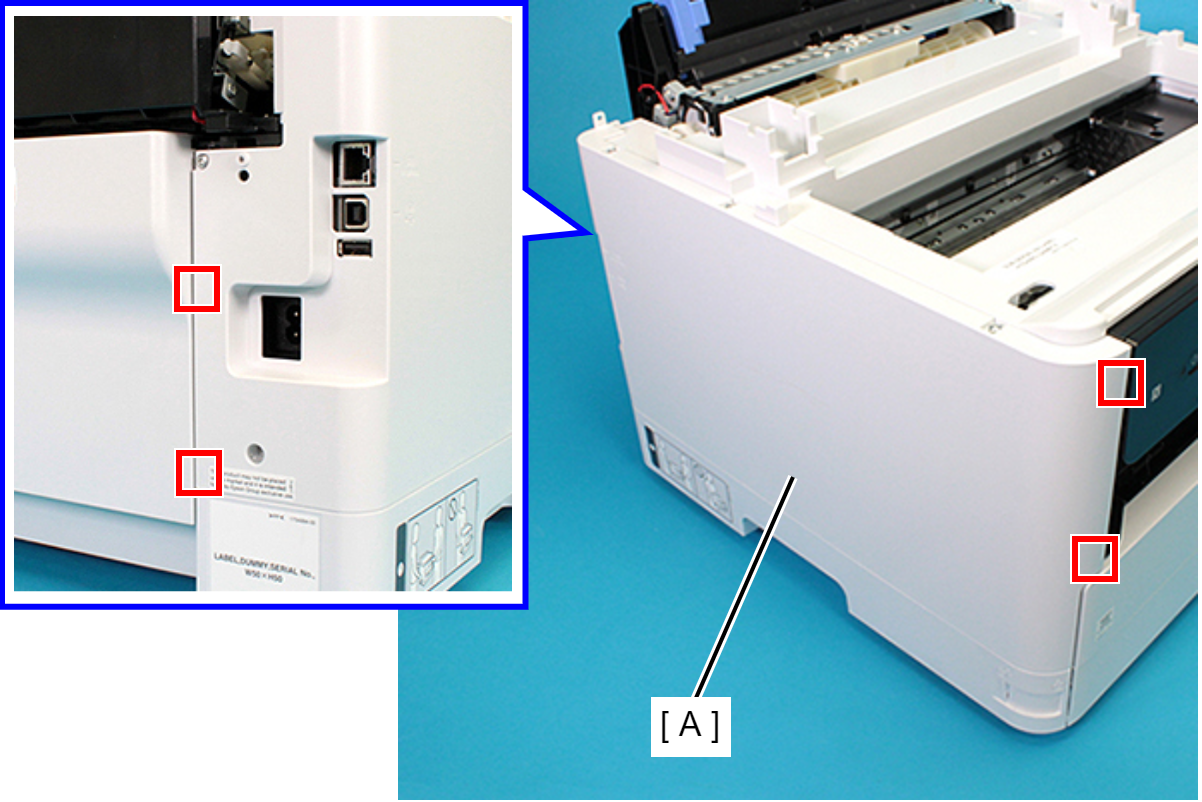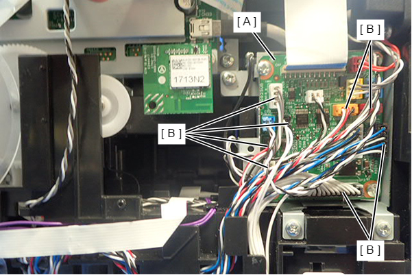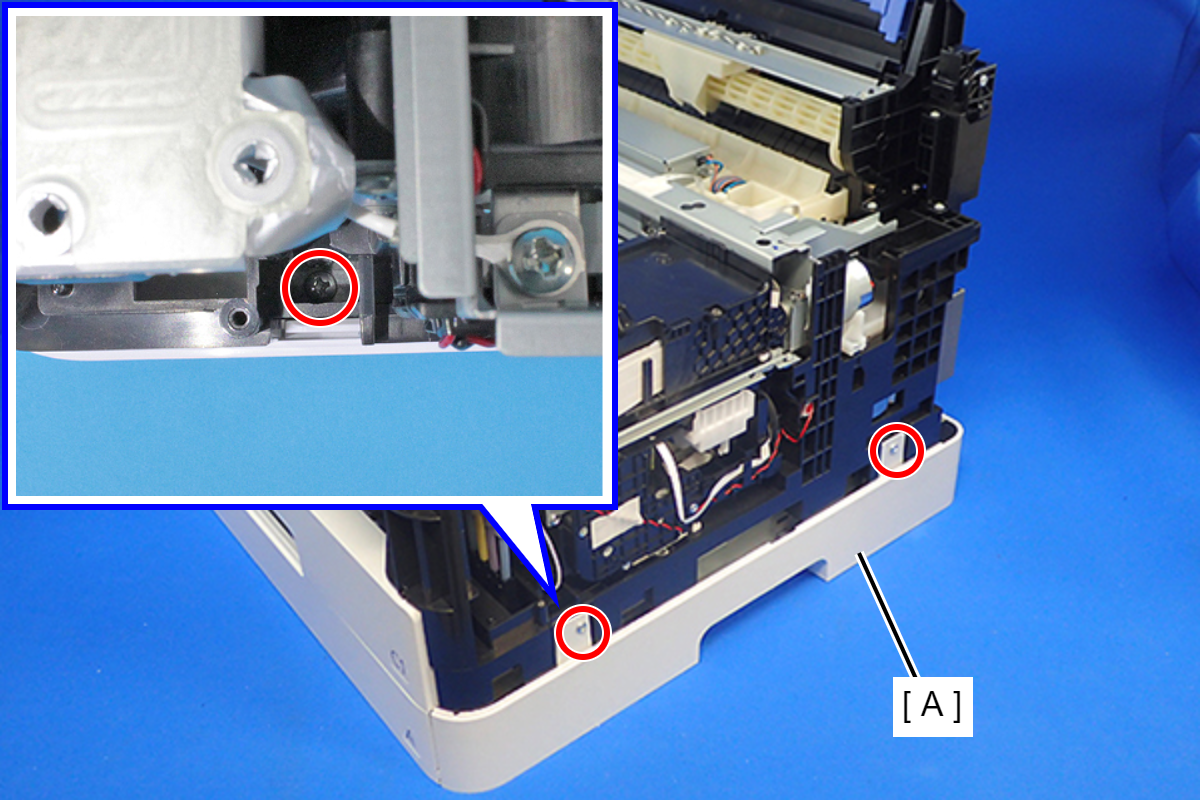 - Open the Printer Cover (A) and remove the four screws, and then remove the Housing ASF (B).