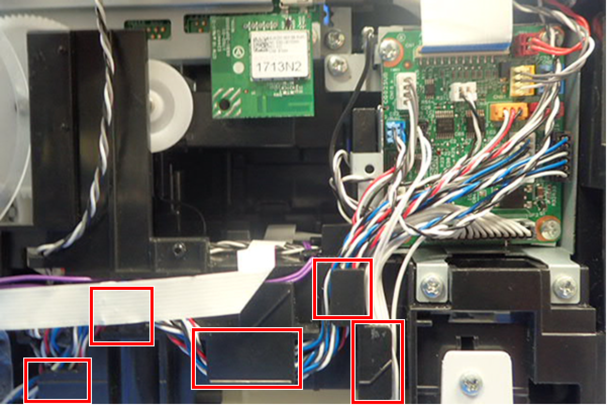 Disconnect the FFCs (A) from the connectors (CN67, CN66, CN68) on the Main Board.