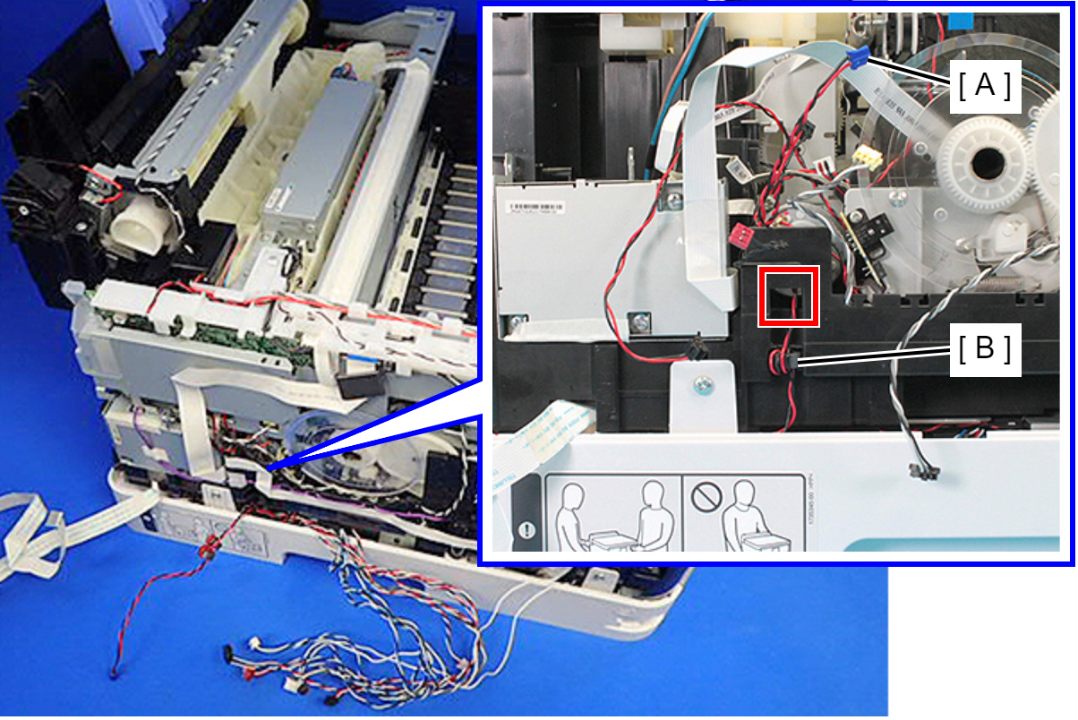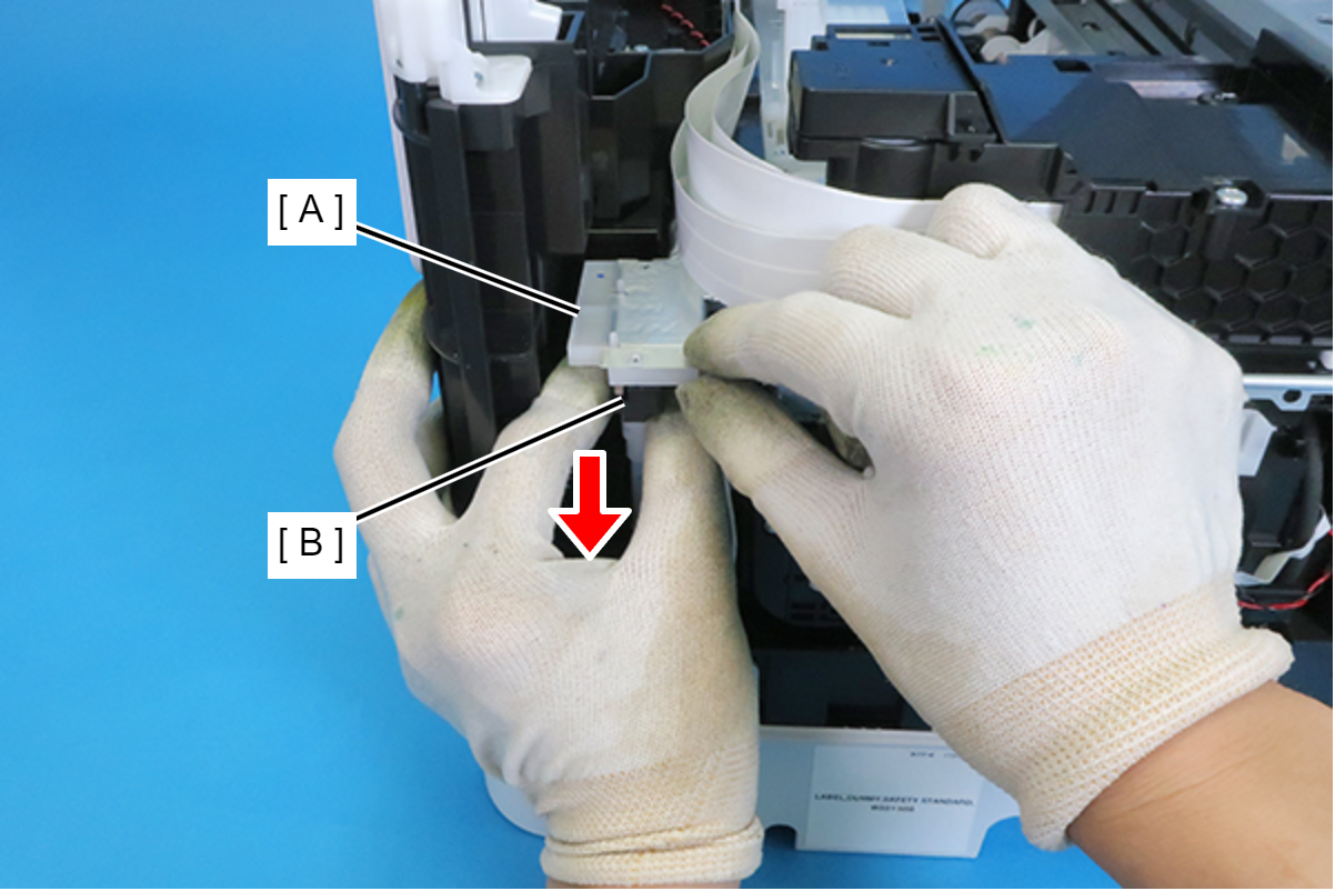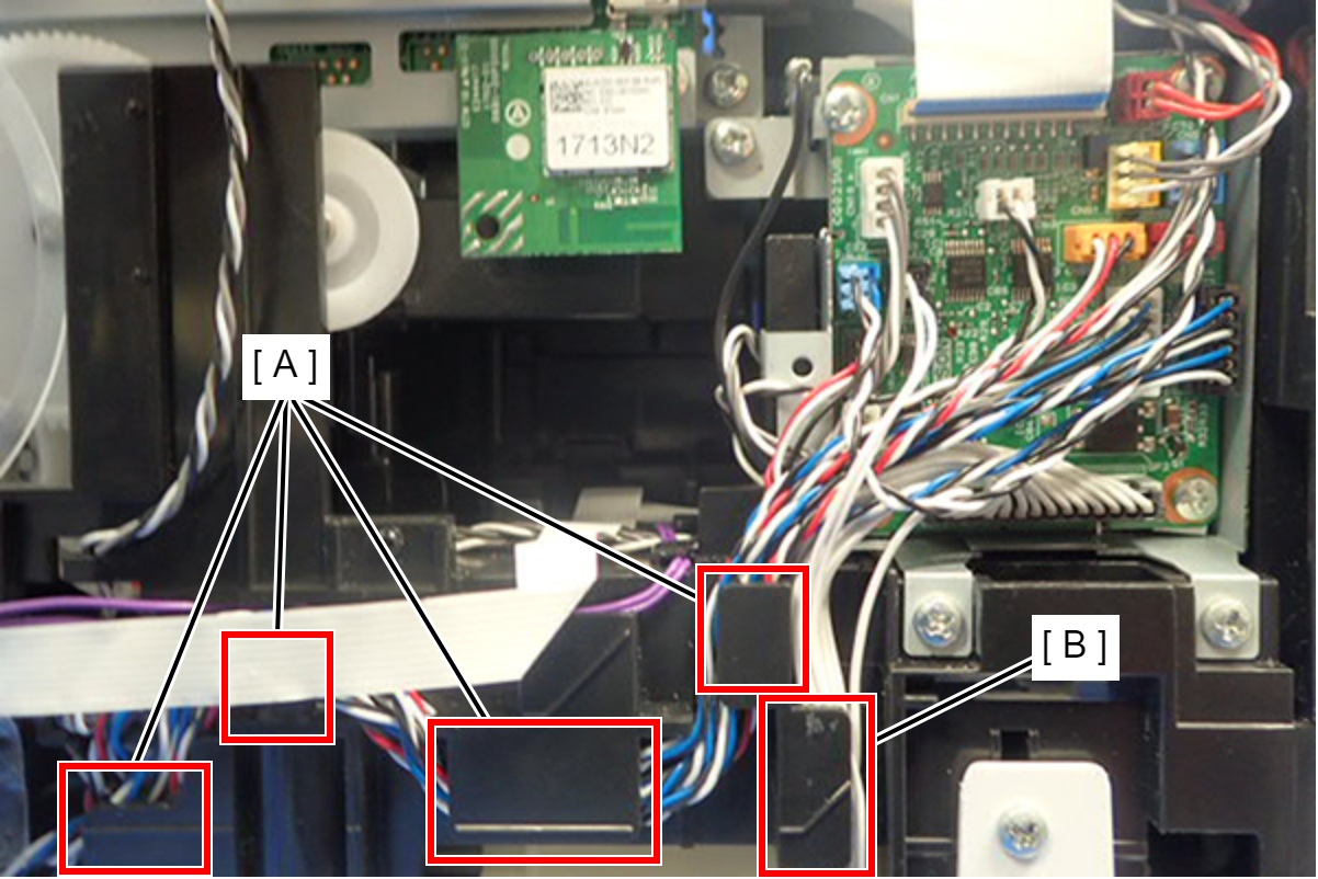 - Remove the acetate tape (A), and release the cable (B) from the two guides.