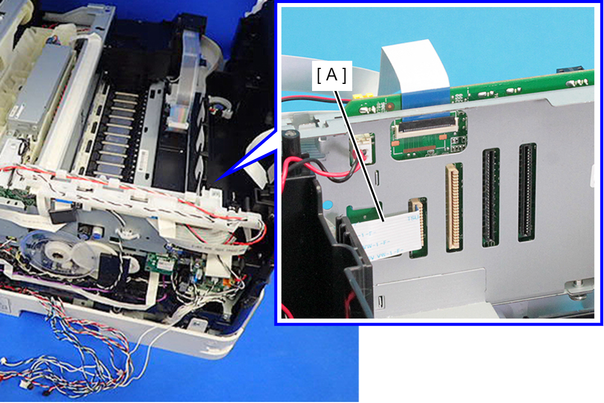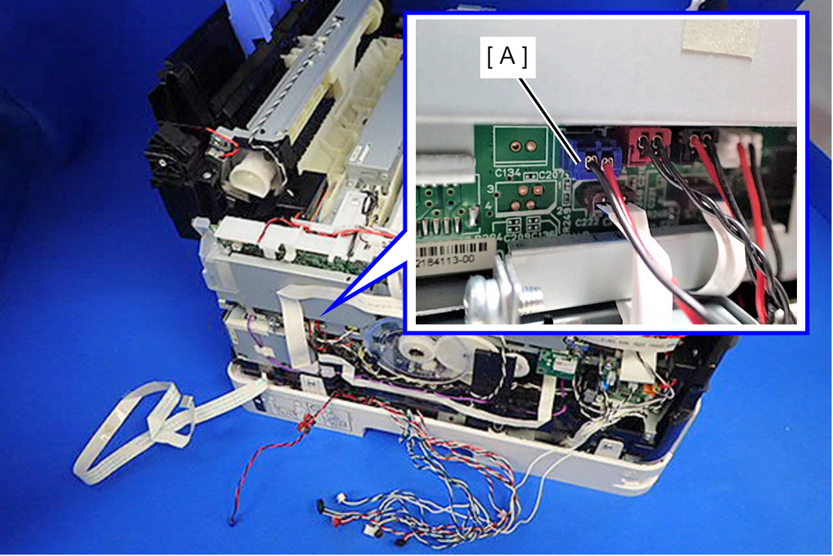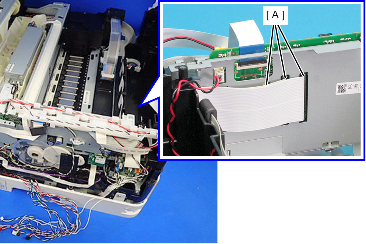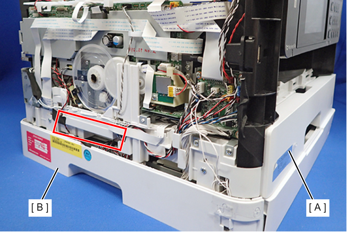 - Remove the acetate tape (A), and release the cable (B) from the two guides.
