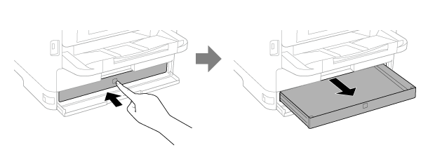 Press to pull out the Ink Pack Tray BK (A), and confirm that the Panel LCD is in normal condition, and not in an error state such as a “Front cover open error”.