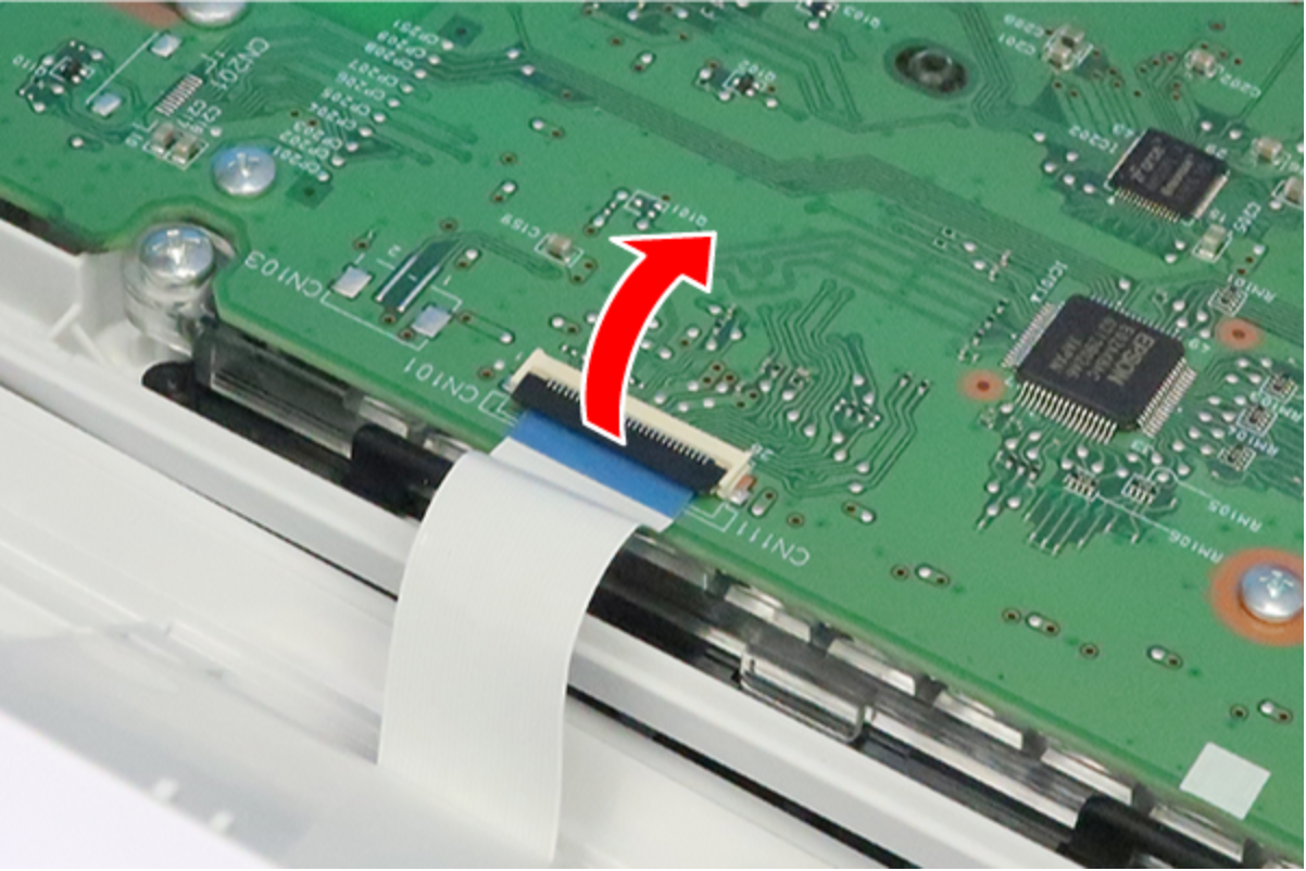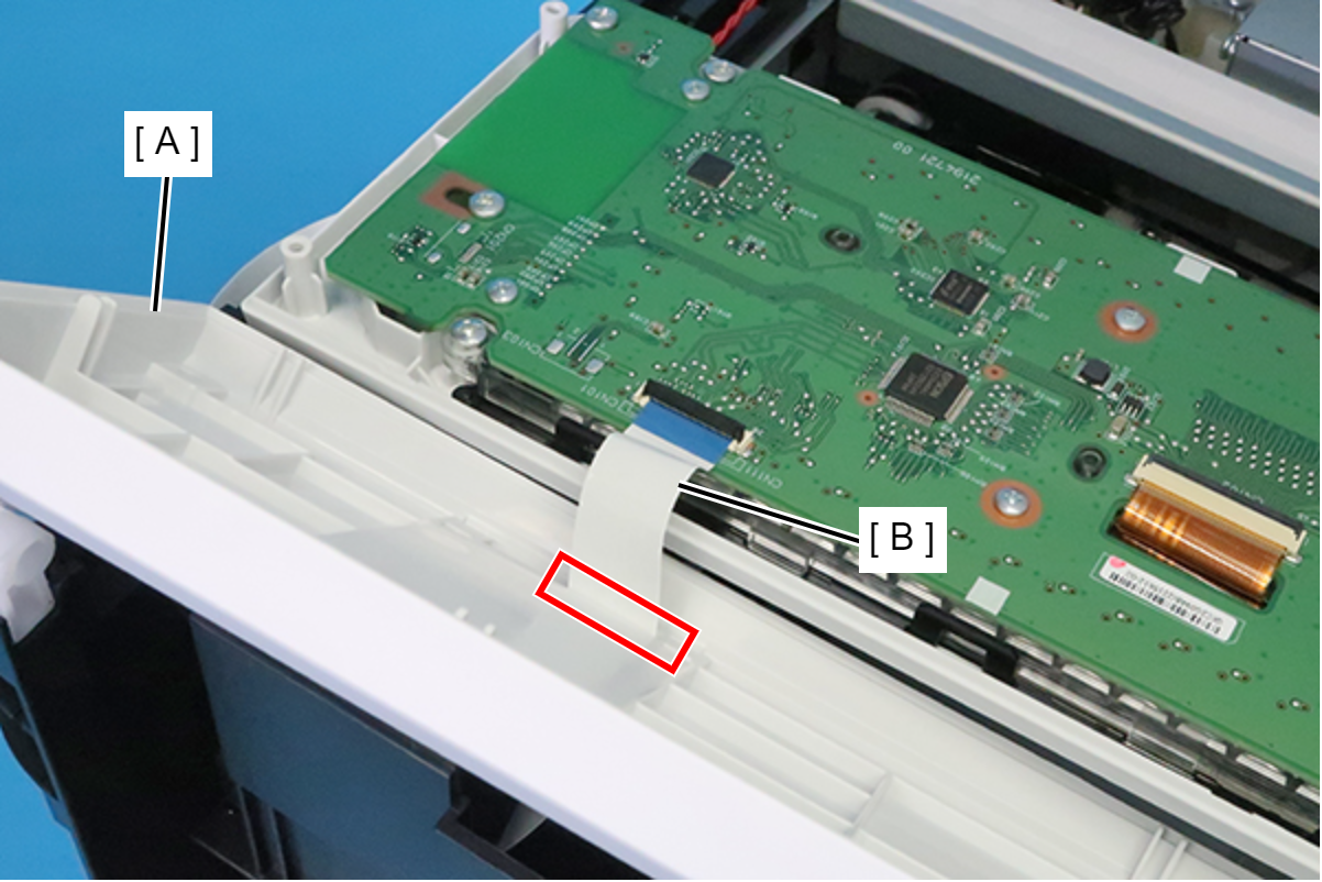 Release the connector lock, and disconnect the FFC (B) from the connector (CN111) on the Panel Board (A).