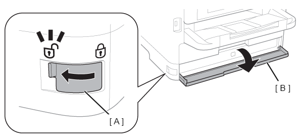 Slide the Cover Lock (A) in the direction of the arrow, then open the Ink Cover (B).