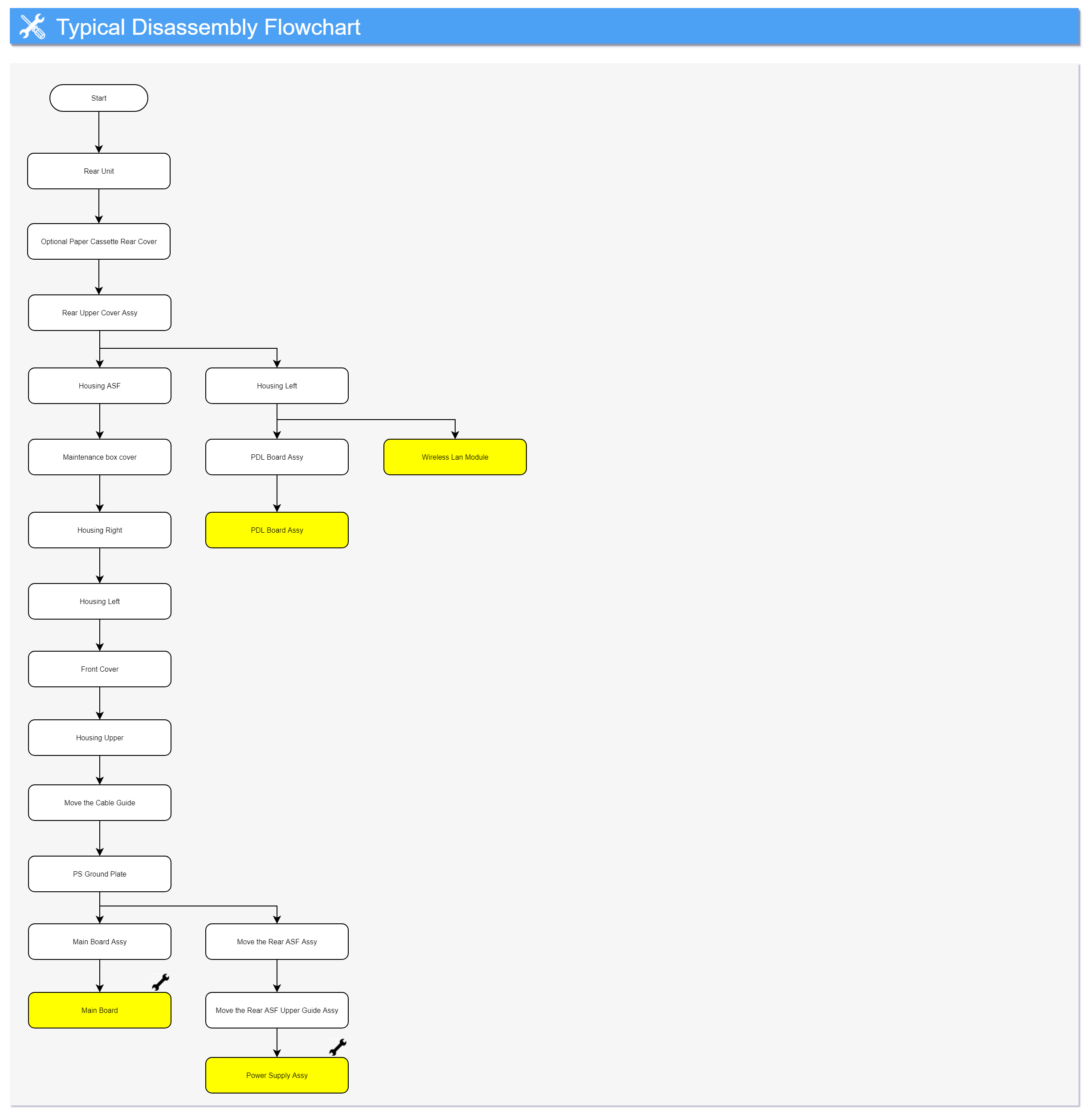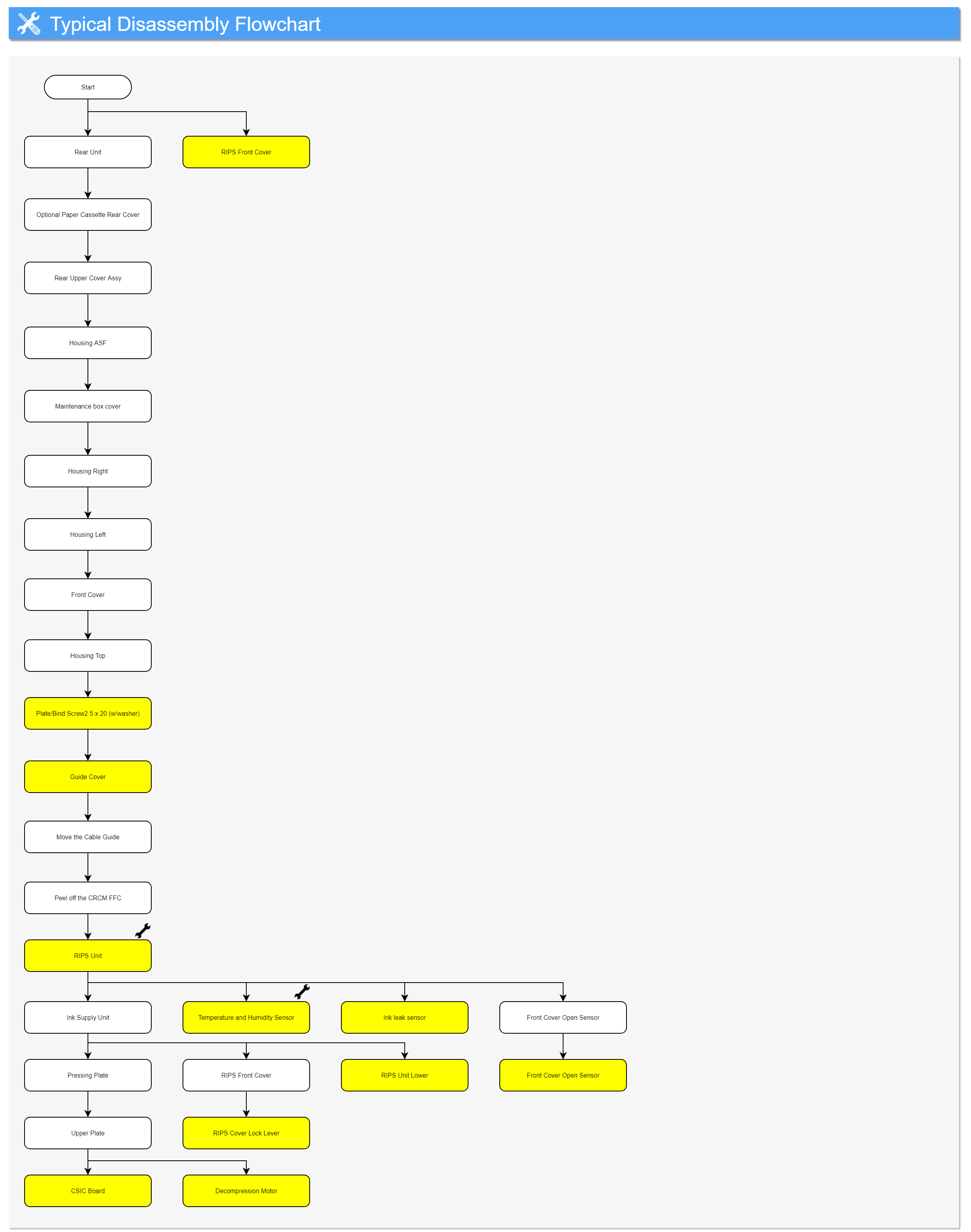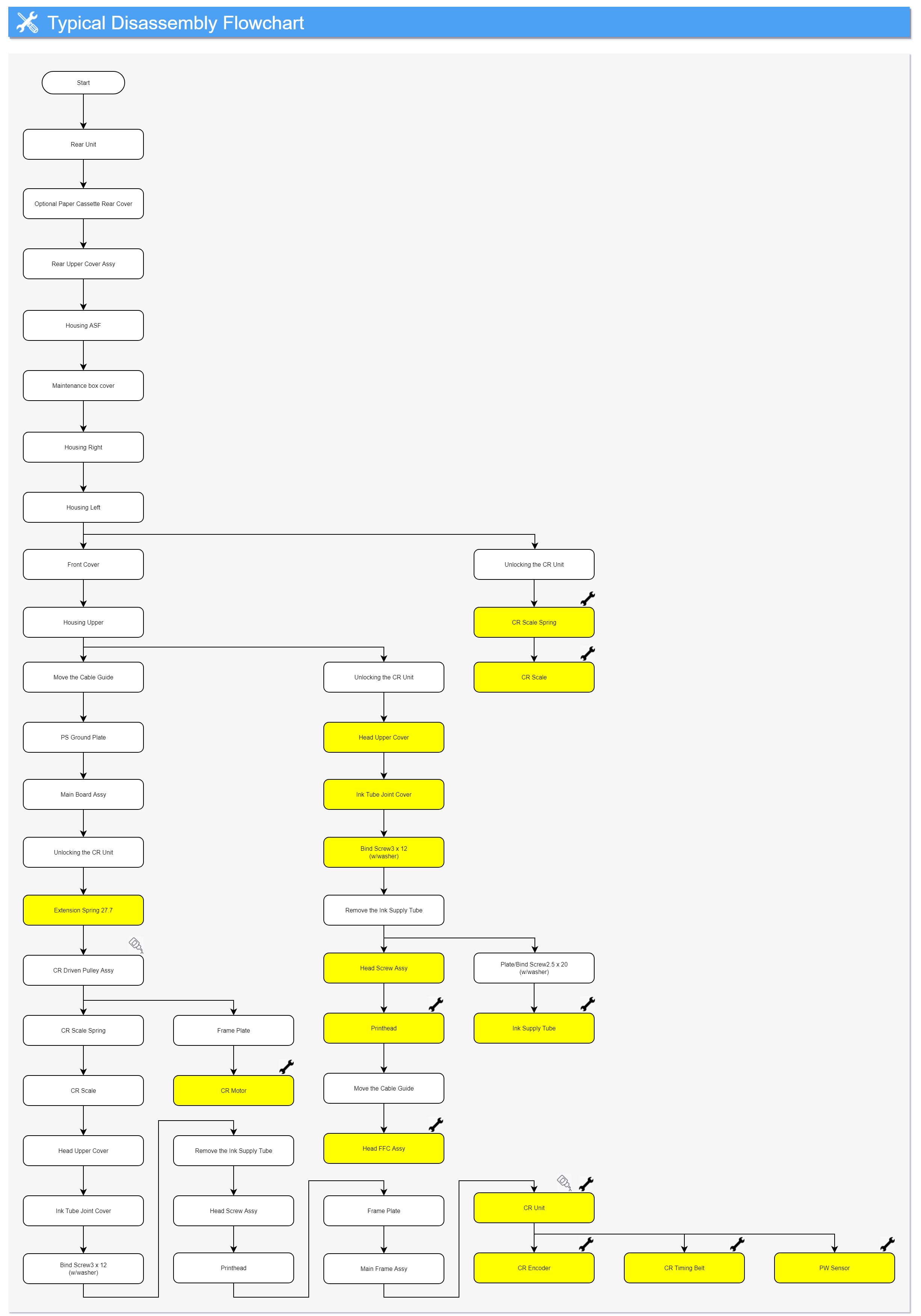 • The yellow colored boxes indicate parts or assemblies for which a procedure is described in this manual.