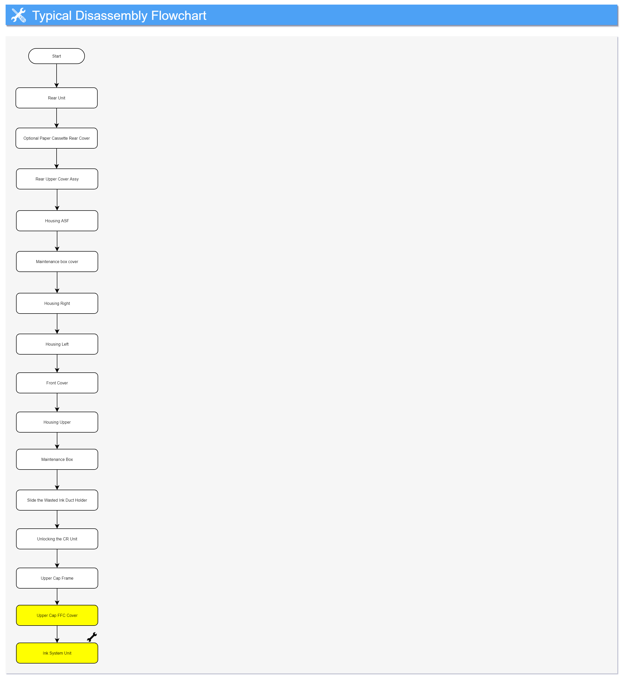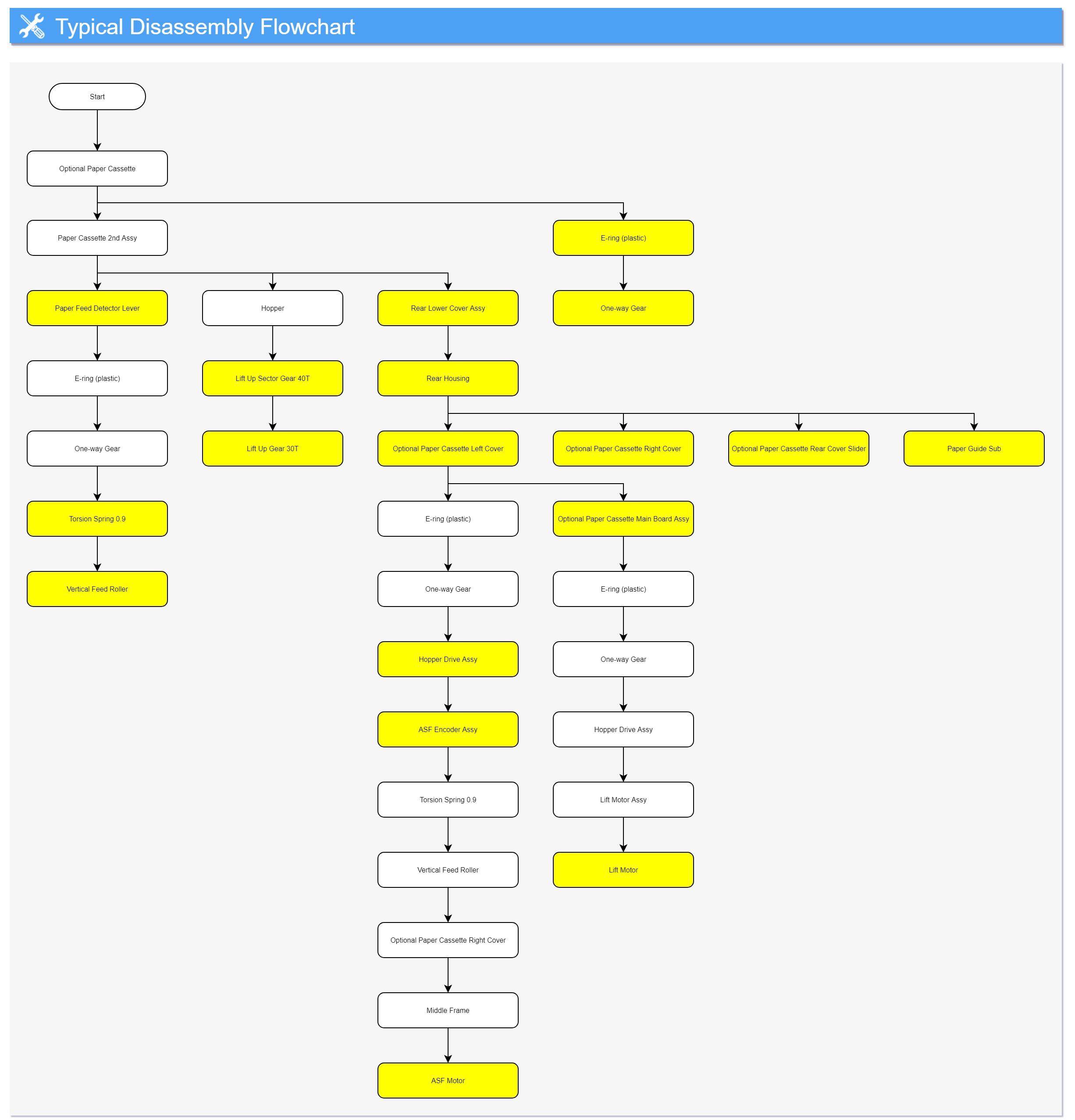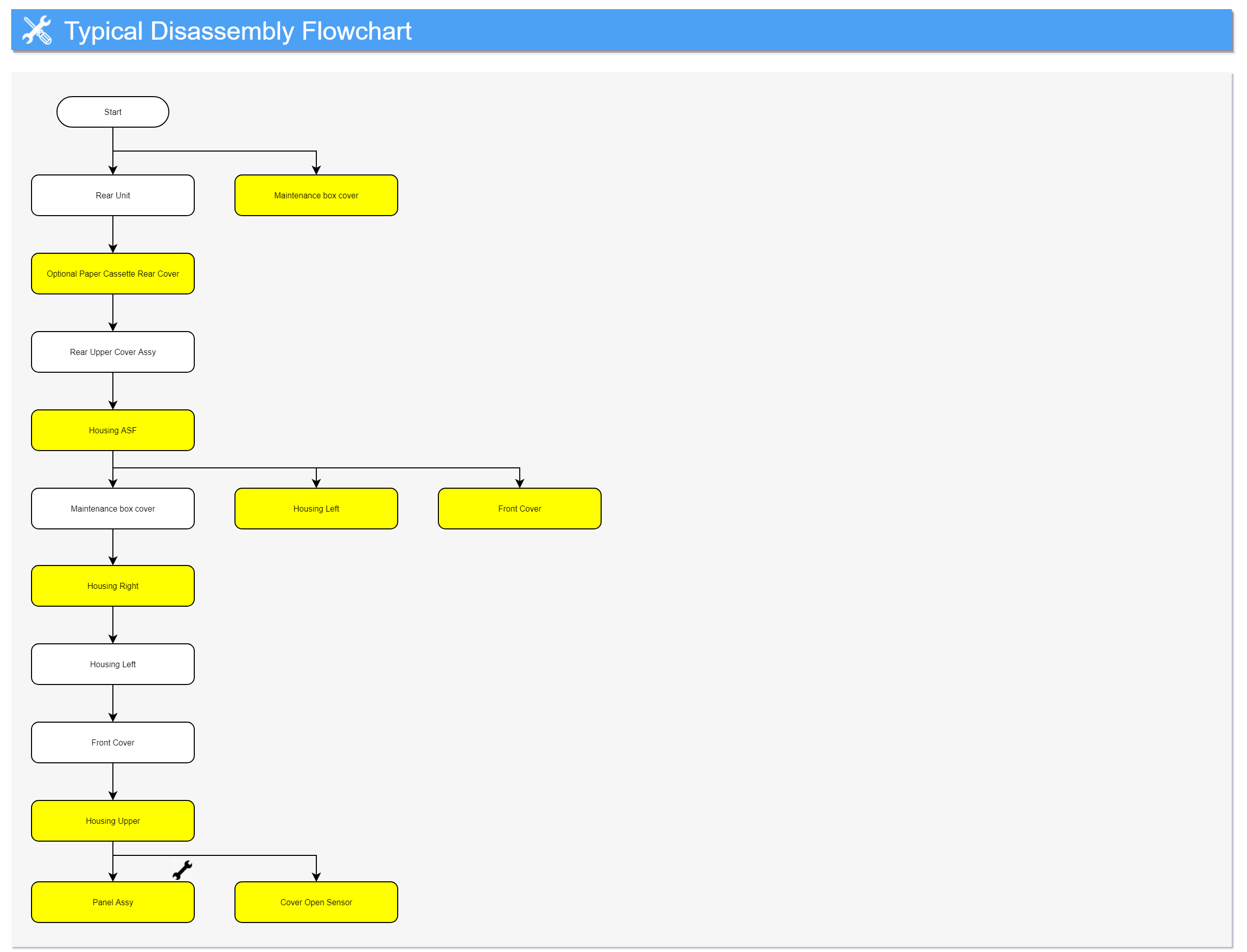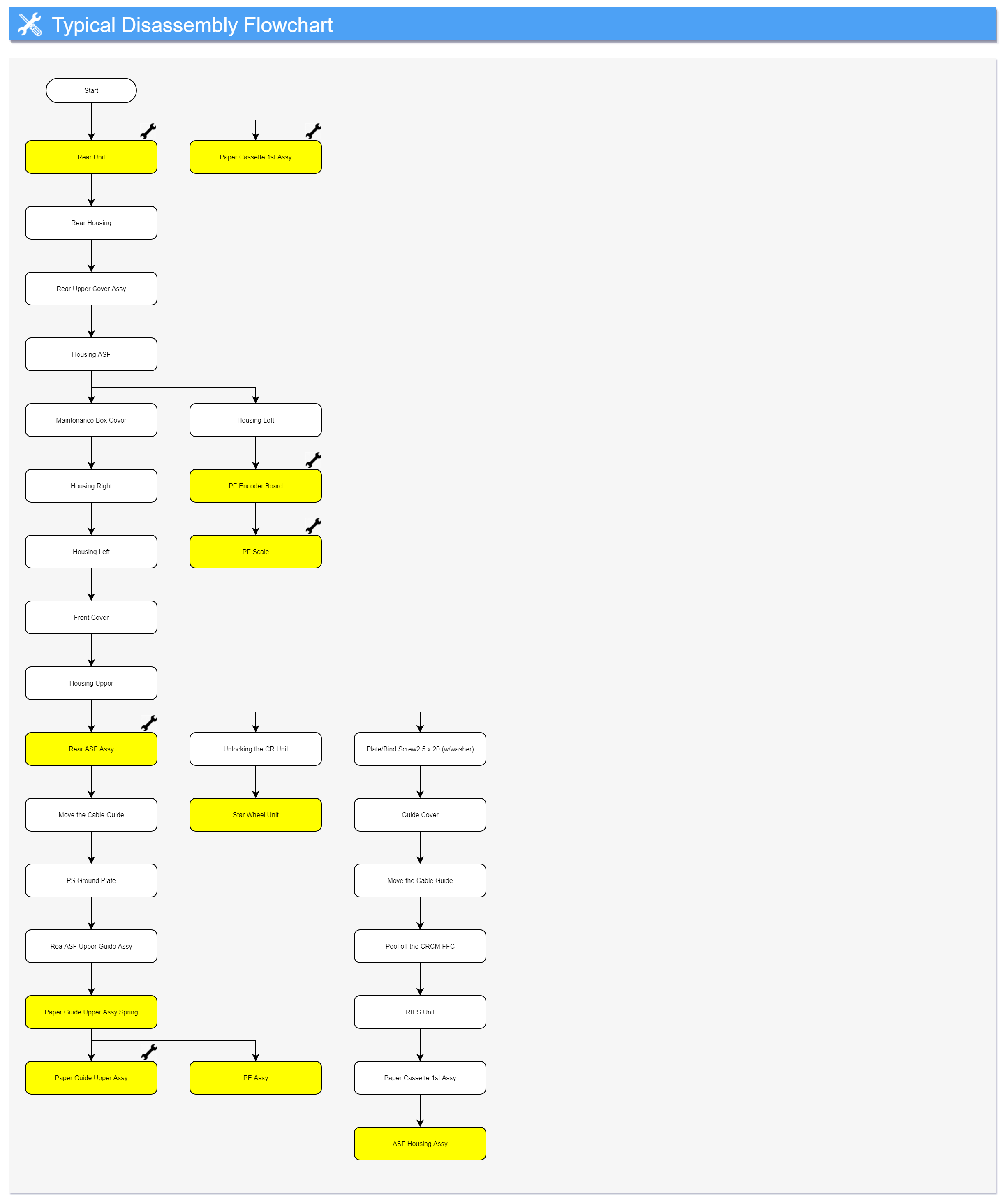 • The yellow colored boxes indicate parts or assemblies for which a procedure is described in this manual.