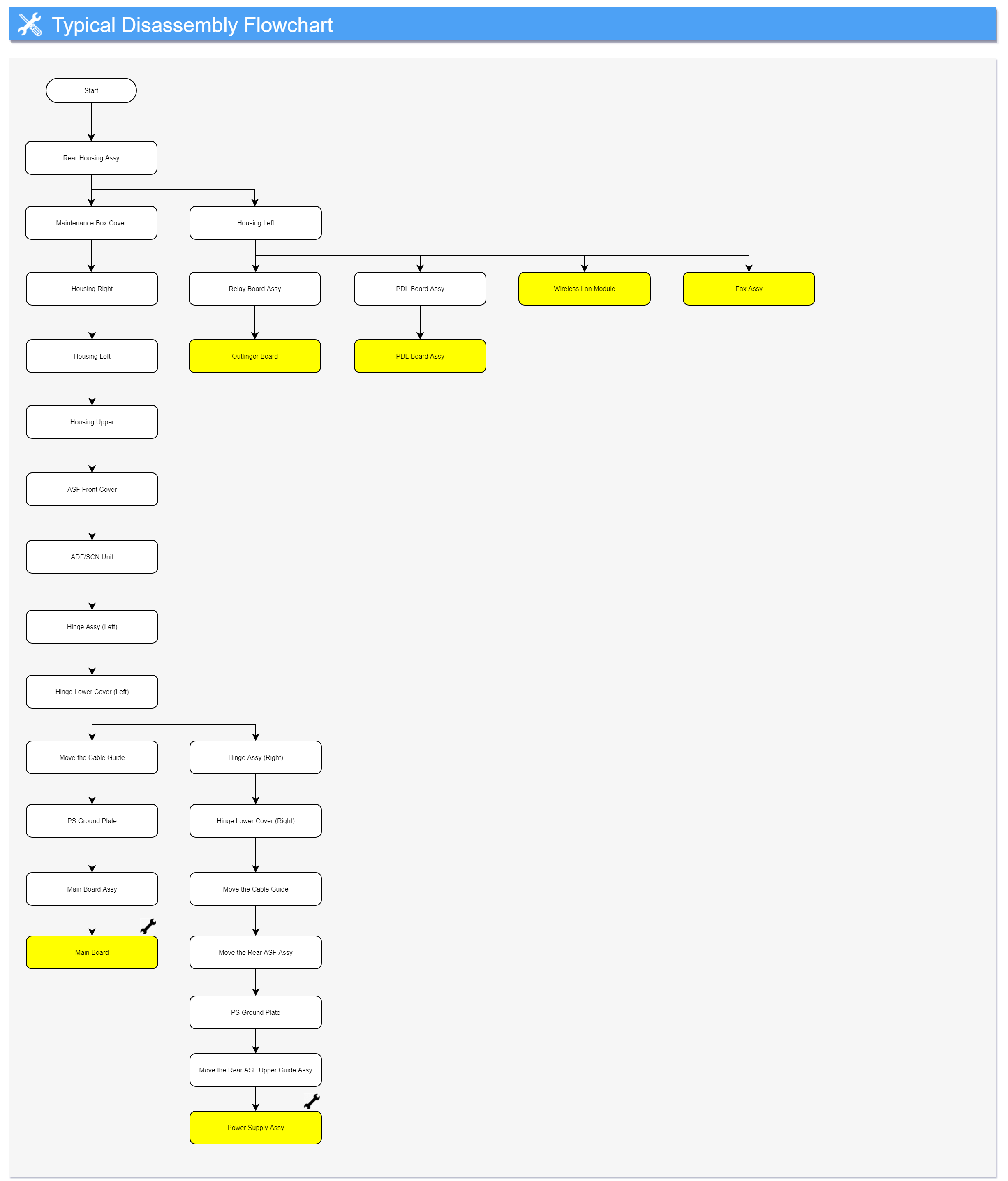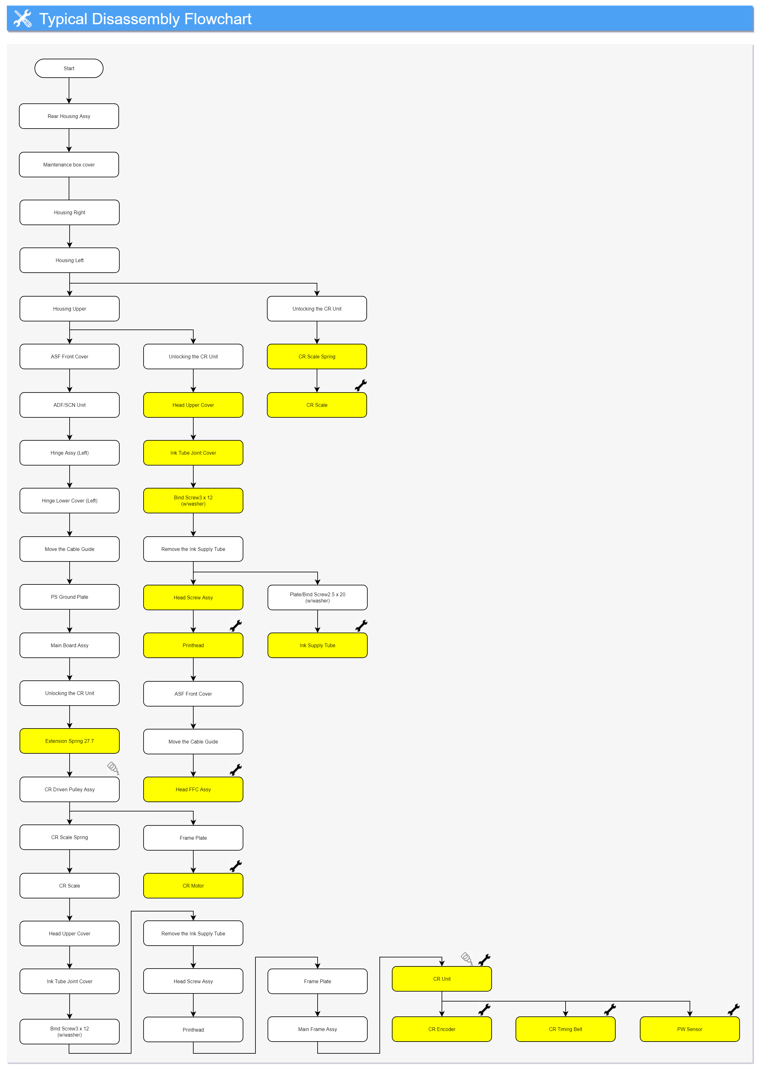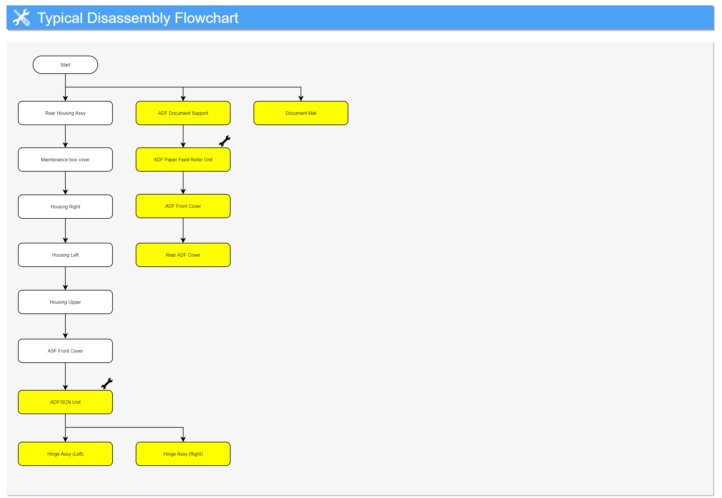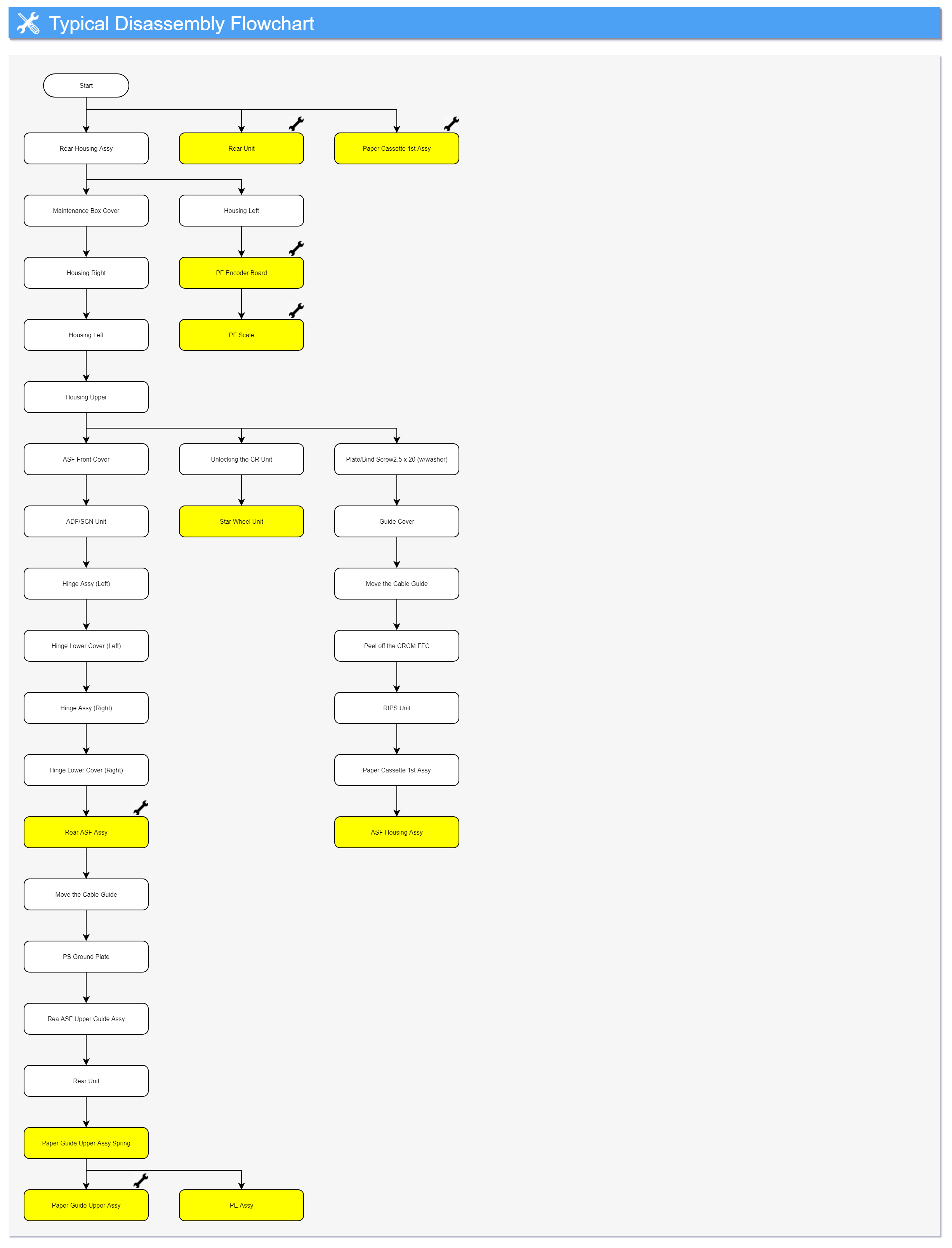 - The yellow colored boxes indicate parts or assemblies for which a procedure is described in this manual.