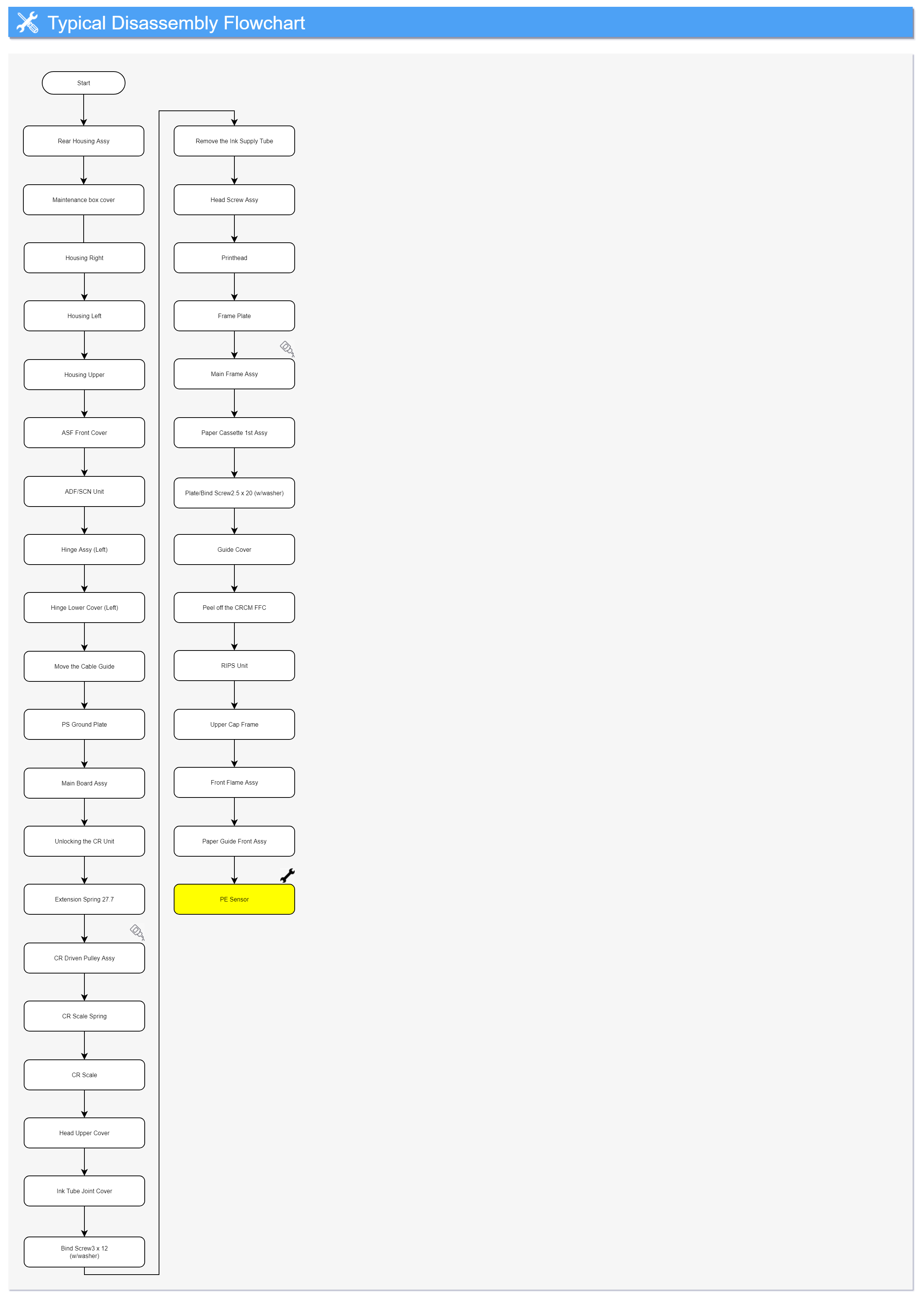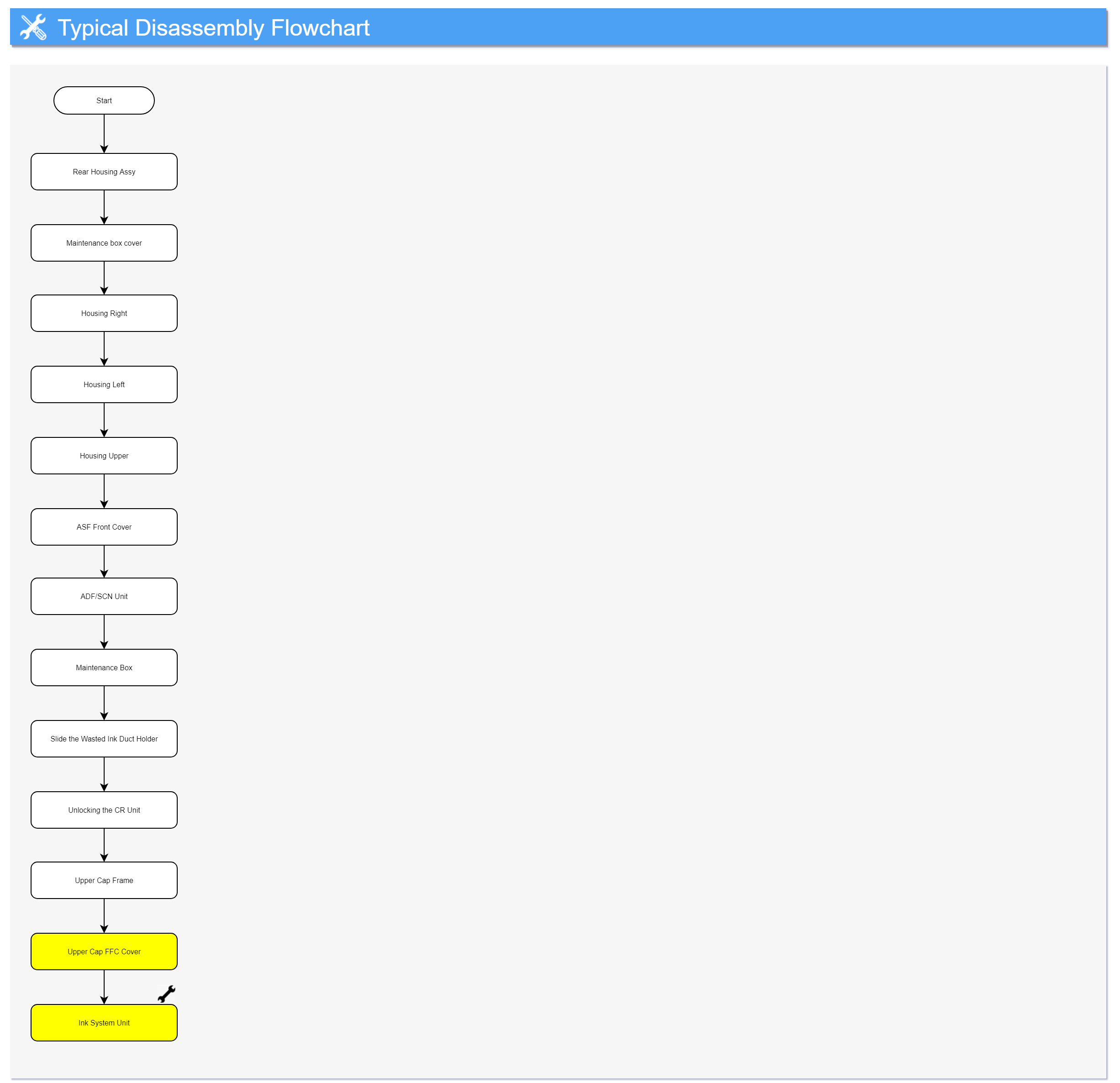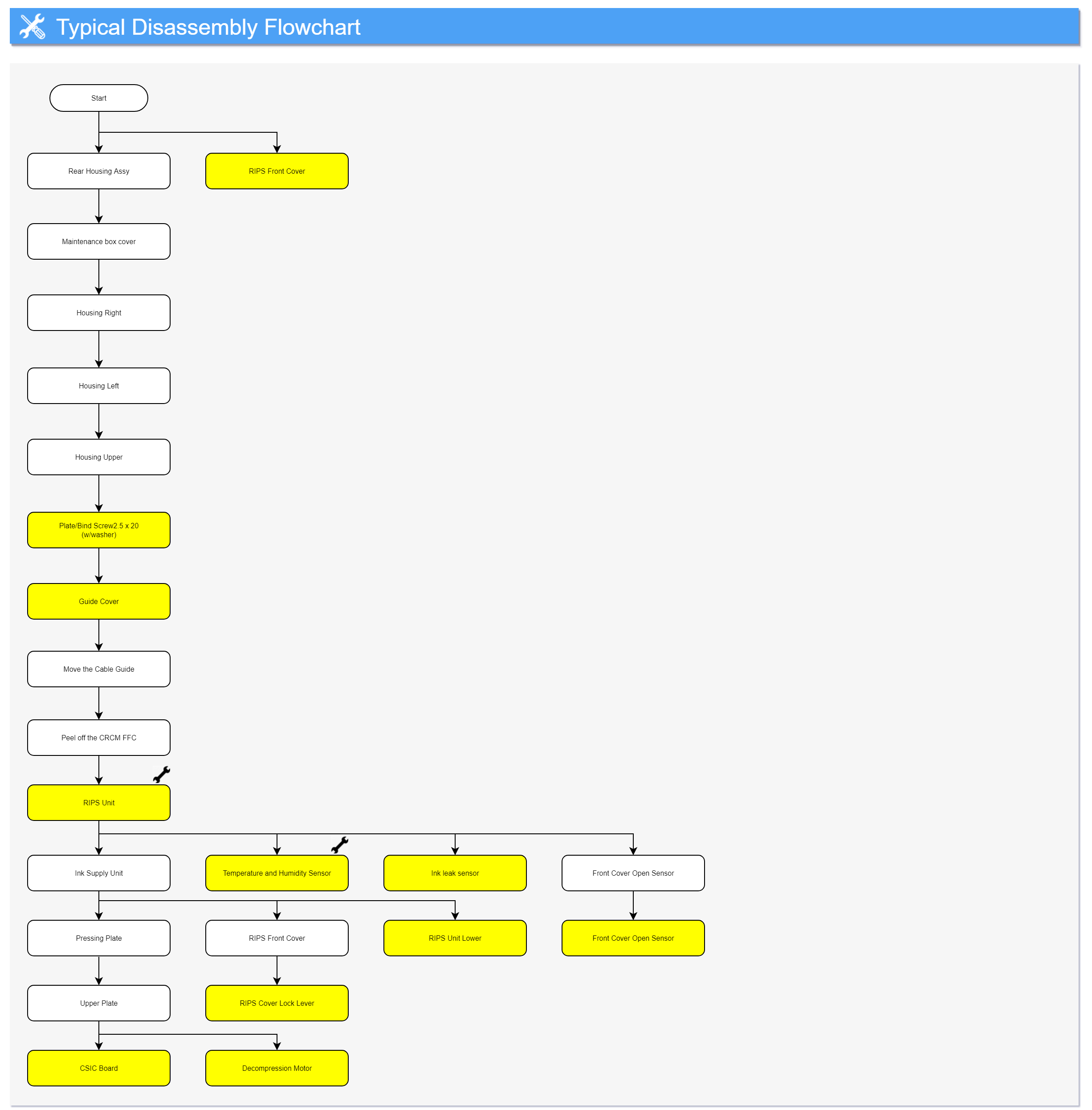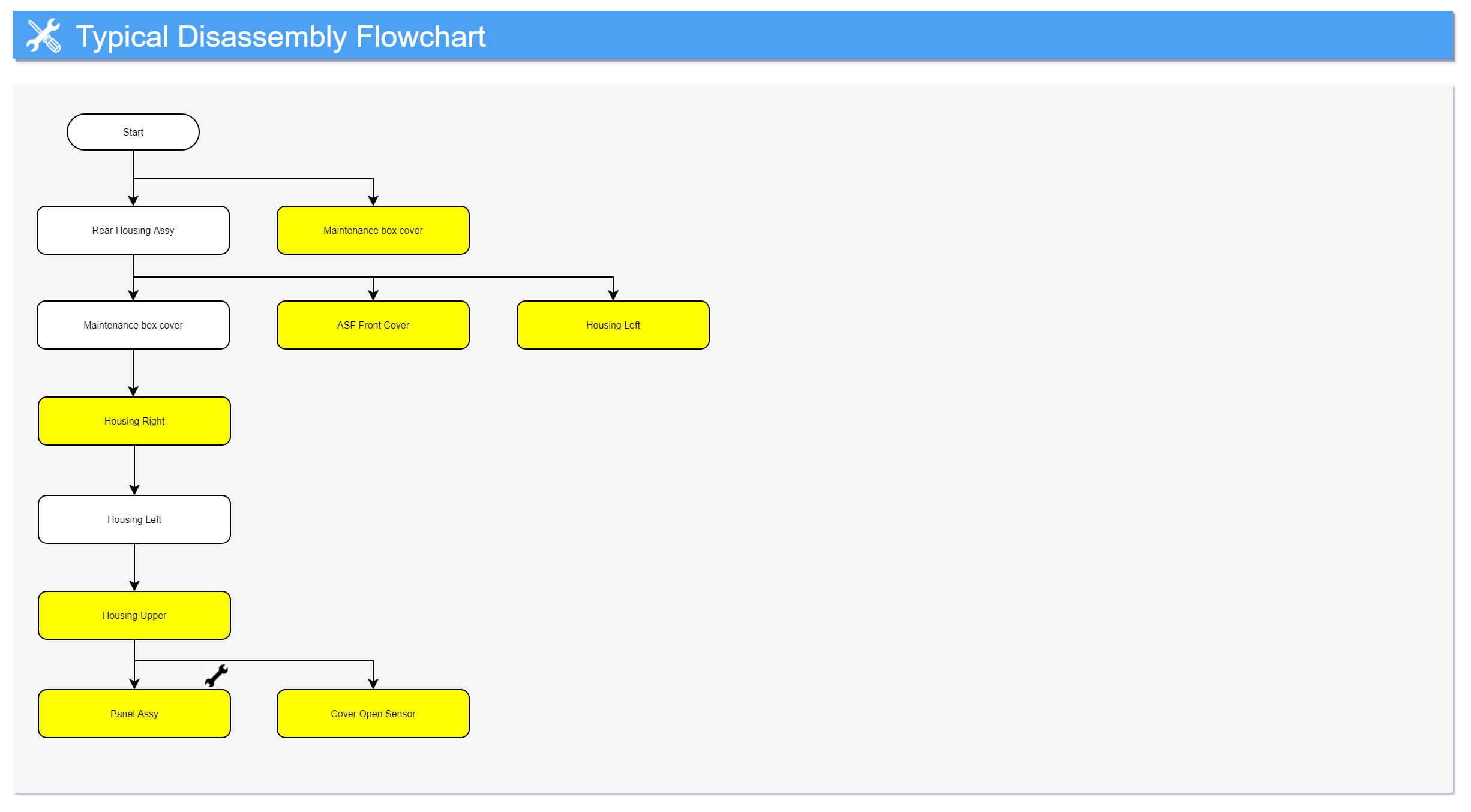 - The yellow colored boxes indicate parts or assemblies for which a procedure is described in this manual.