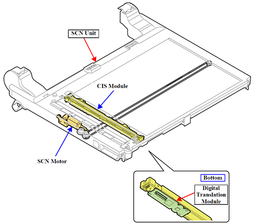 The scanner mechanism consists of a CIS Module that scans documents and SCN Motor that drives the Scanner Carriage.